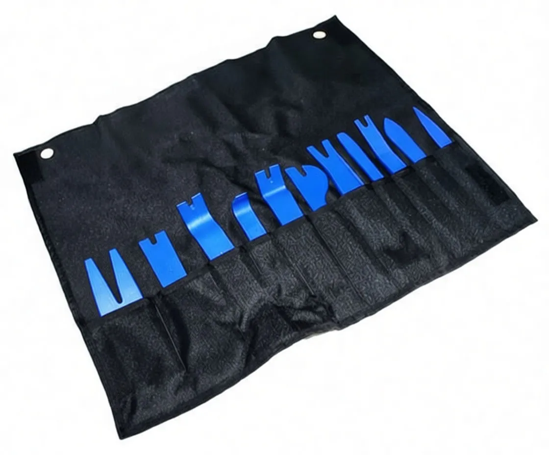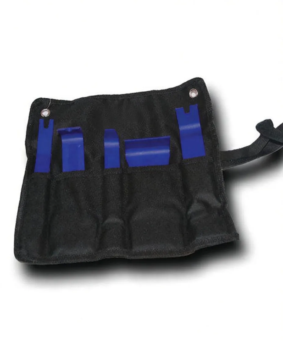 Professional-grade plastic trim removal tools in organized pouch. Non-damaging design for clips, panels, and interior trim work.