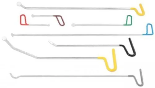 Professional dent repair kit for hail damage and minor dents without paint damage. 7 specialized steel rods with color-coded handles and carrying case.
