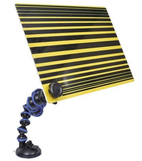 Professional dent detection tool with reflective striped panel and adjustable suction-cup mounting for precise bodywork alignment.