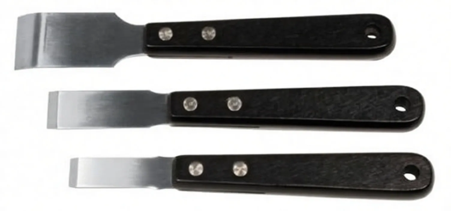 Professional-grade stainless steel scrapers with ergonomic wooden handles. Essential finishing tools for paint removal, putty work, and surface prep.