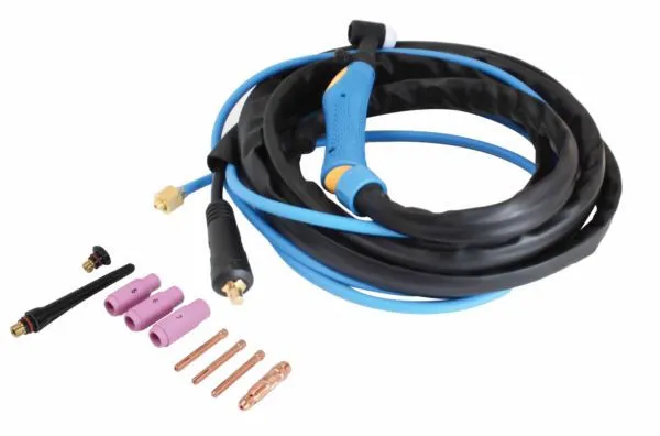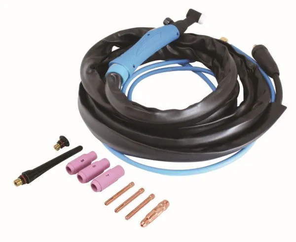 Complete TIG torch assembly with integrated gas regulation, 4m power cable, and full consumable set for 150A lift-start argon welding.