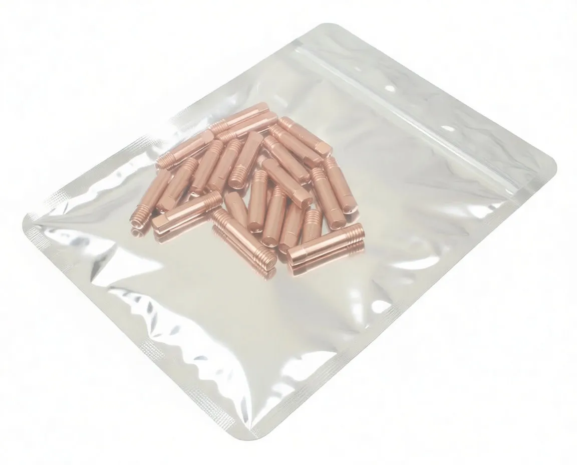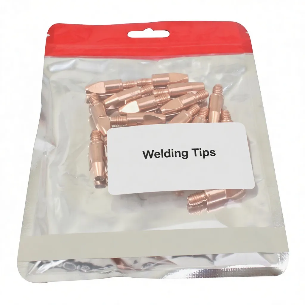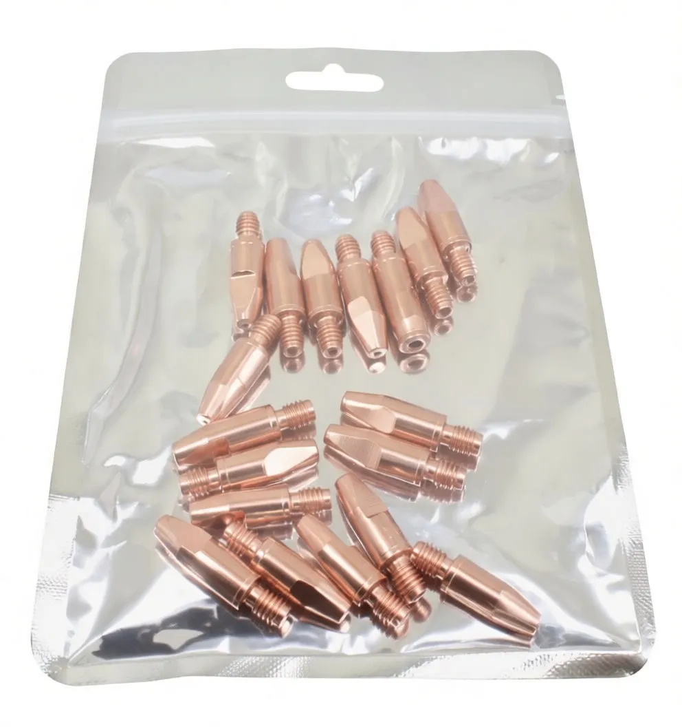 OEM copper welding contact tips for MB25 guns, M6 threaded, 20-piece bulk pack. Essential consumable for continuous wire feed welding operations.