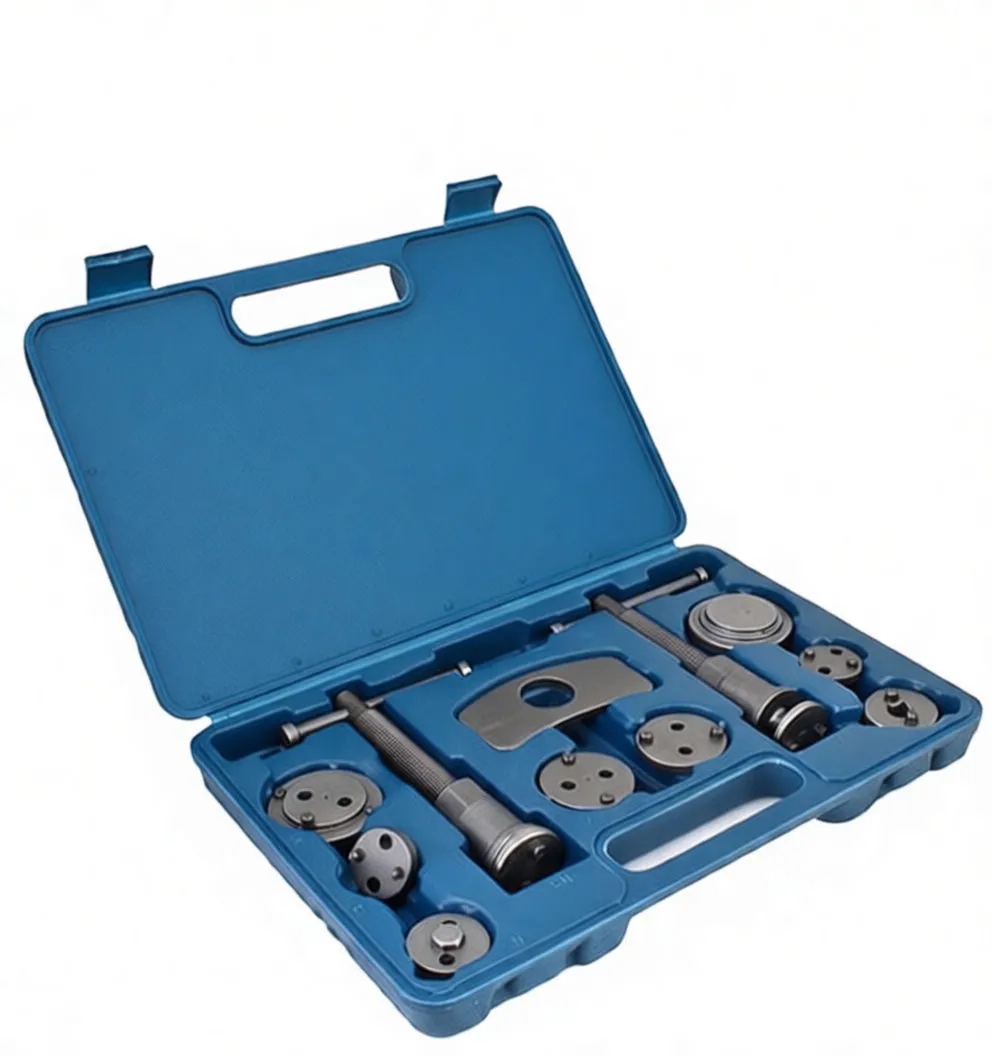 Essential brake service kit with adjustable wind-back tool and adapter plates for European vehicle caliper maintenance.