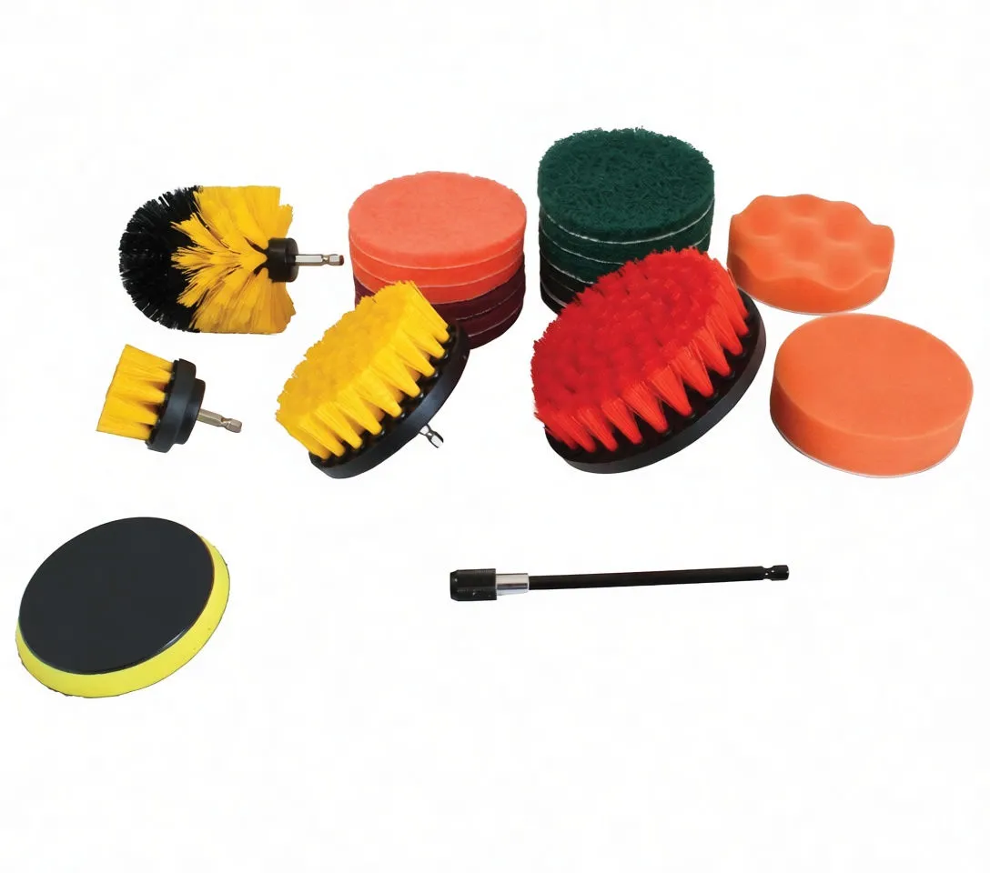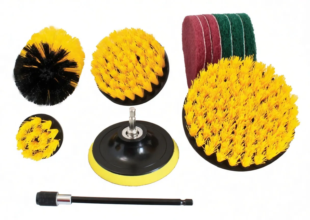 Complete 12-piece drill attachment set with brushes, scouring pads, and extensions for professional grout, surface, and equipment cleaning.