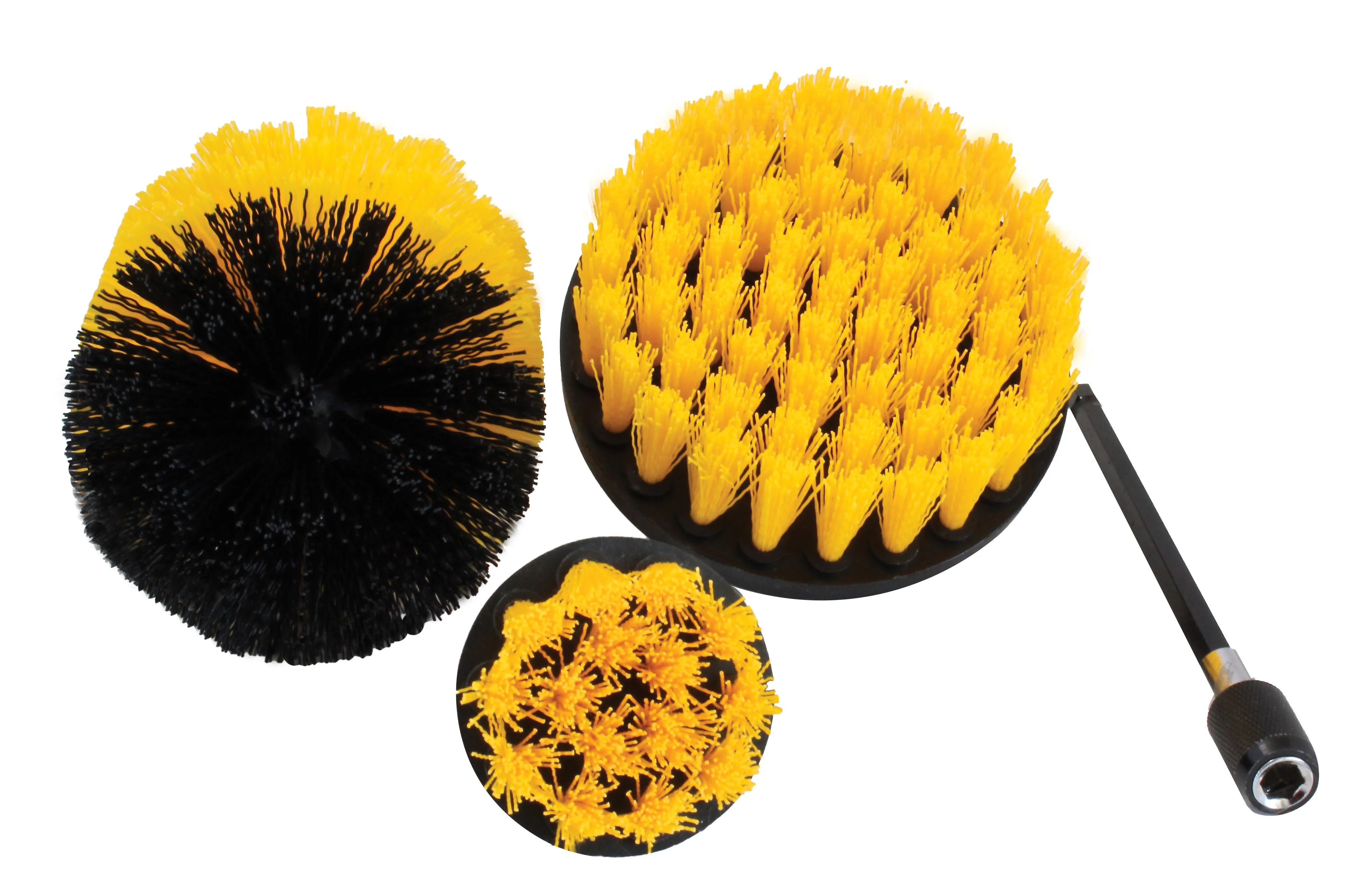 Professional-grade drill brush set with four attachments for efficient vehicle detailing and cleaning applications.
