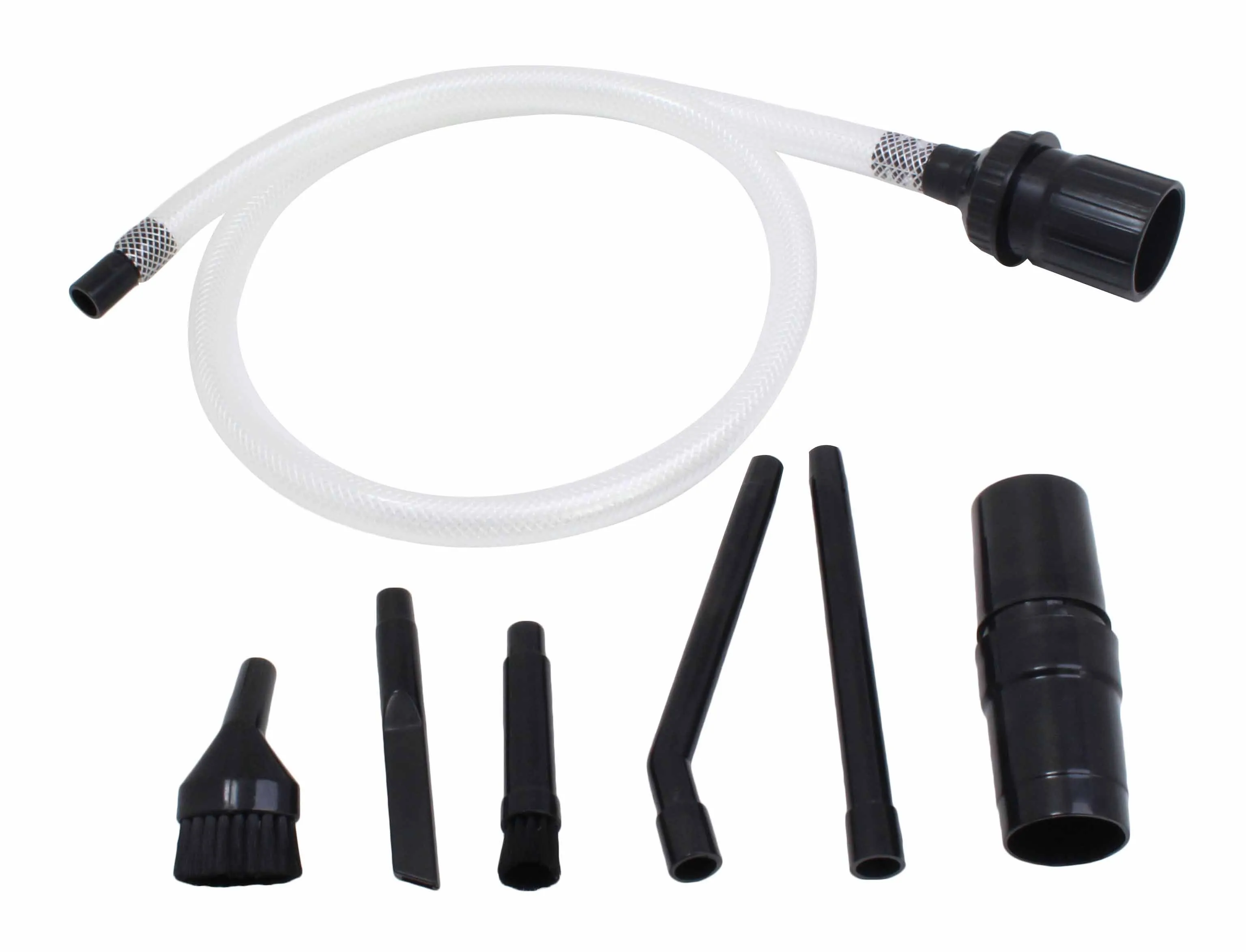 Complete vacuum attachment kit with hose, extensions, and specialized nozzles for professional automotive detailing and interior cleaning.