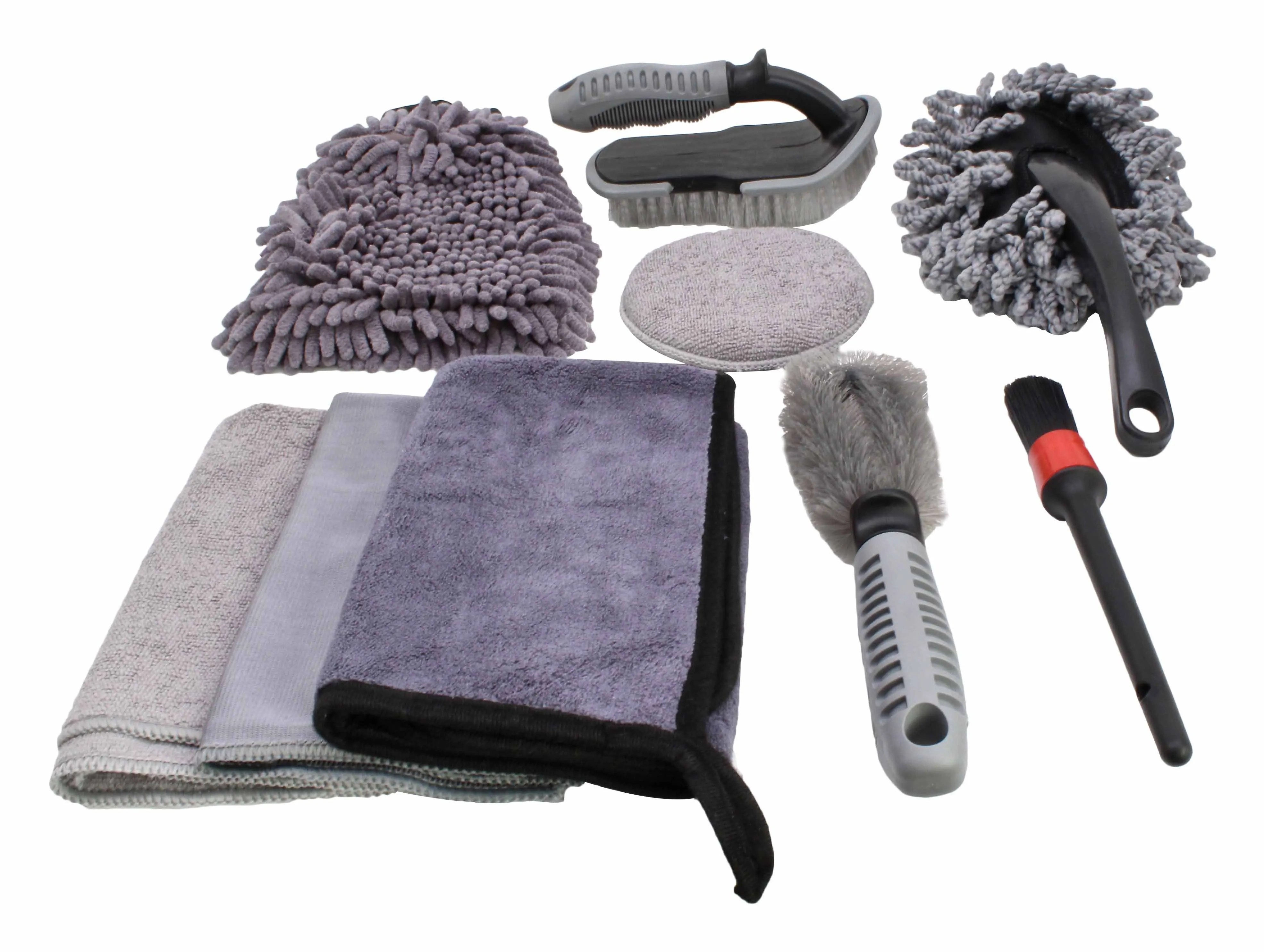 Professional-grade 9-piece car wash set with microfiber cloths, brushes, and applicator pads for complete vehicle detailing.