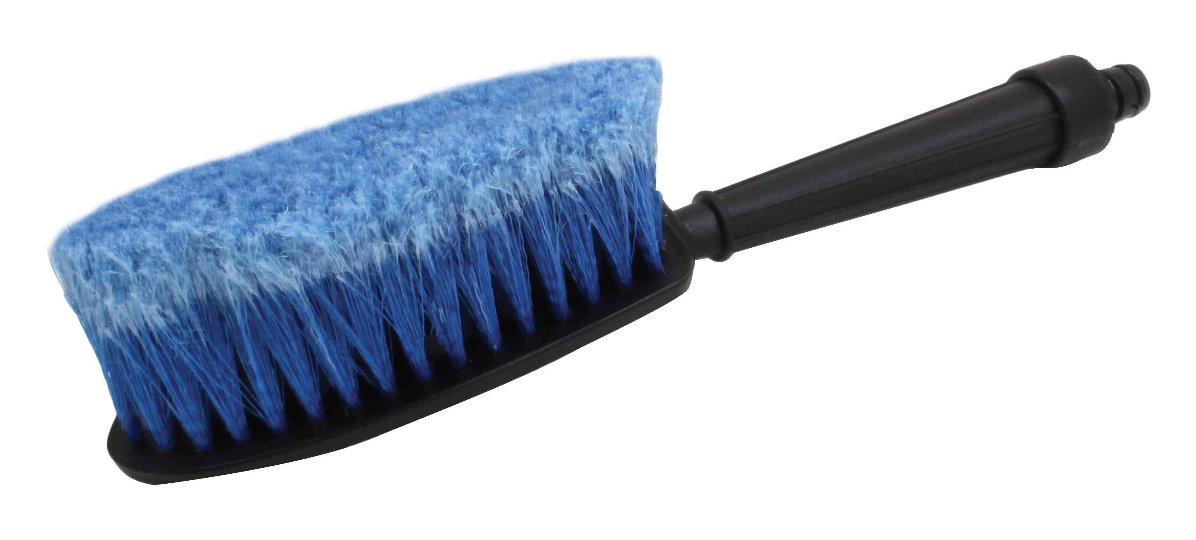 Gentle water-fed car wash brush with soft PVC bristles and direct hose connection for scratch-free cleaning of varnished surfaces.