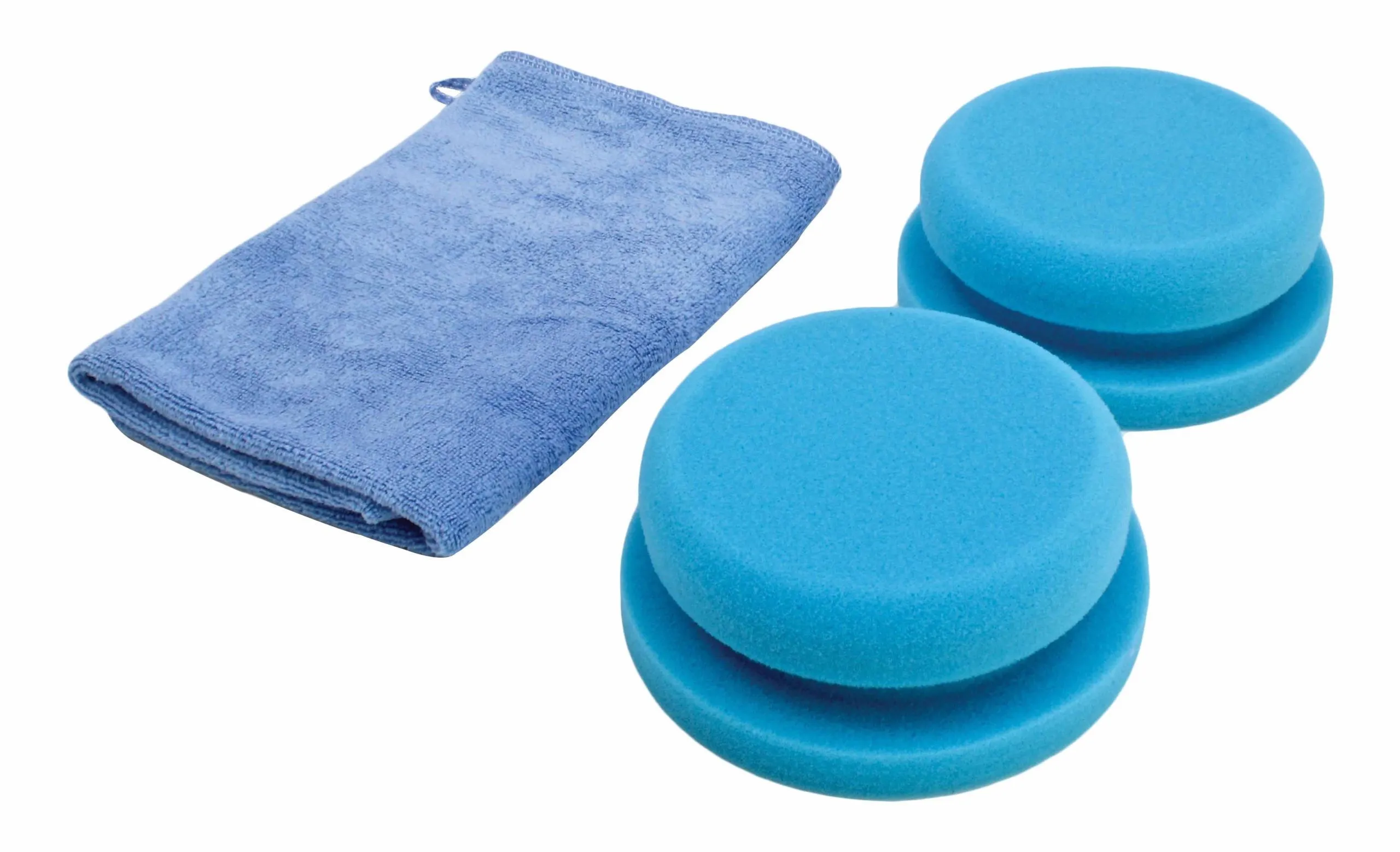 Professional polishing sponges and microfiber cloth bundle for detailing and paint finishing applications.