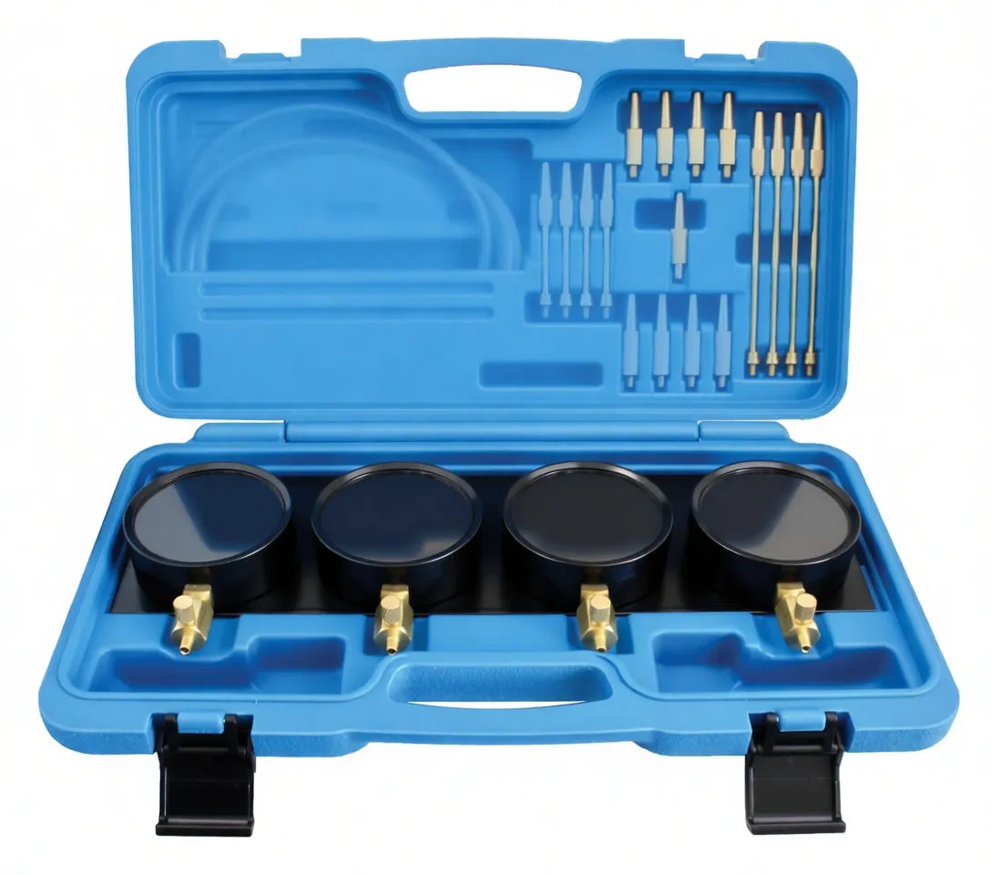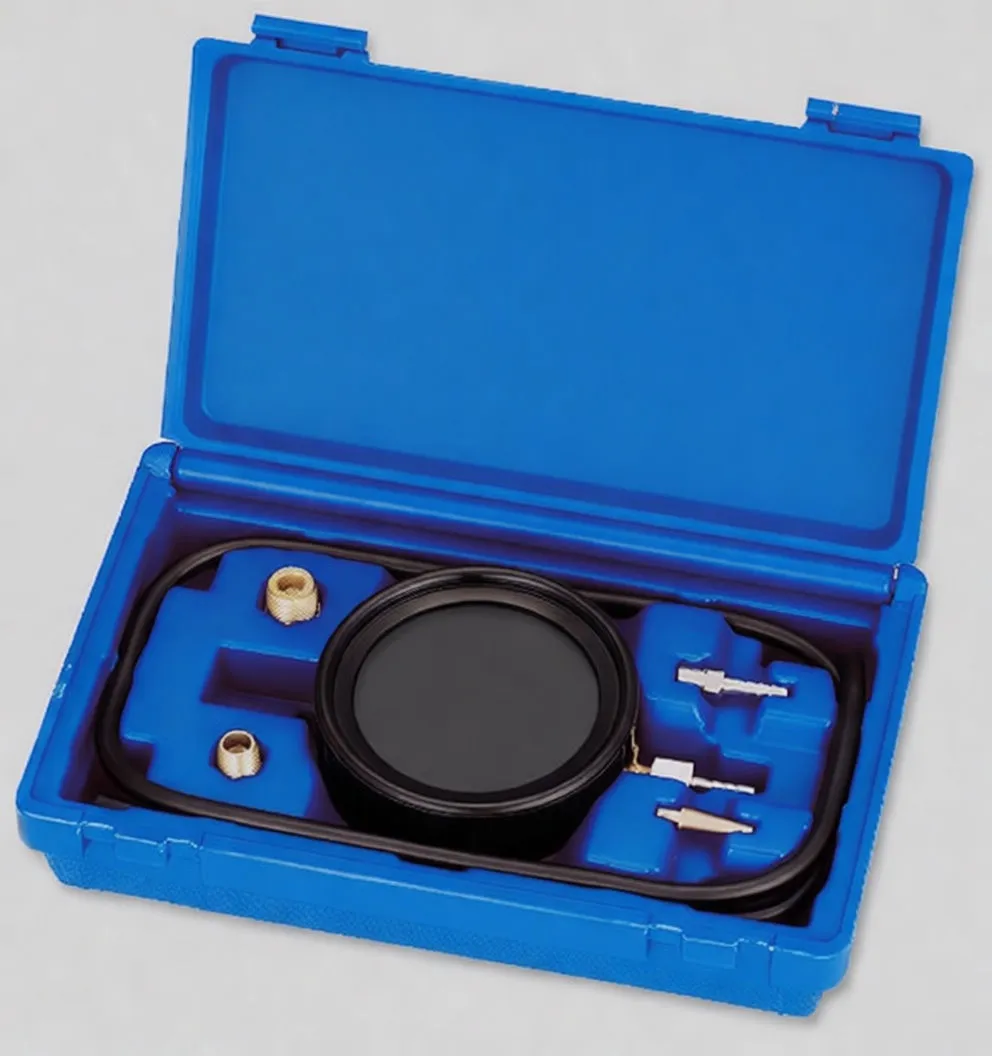 Professional-grade vacuum and fuel pump diagnostic kit with calibrated gauge, brass adapters, and carrying case for accurate engine system testing.