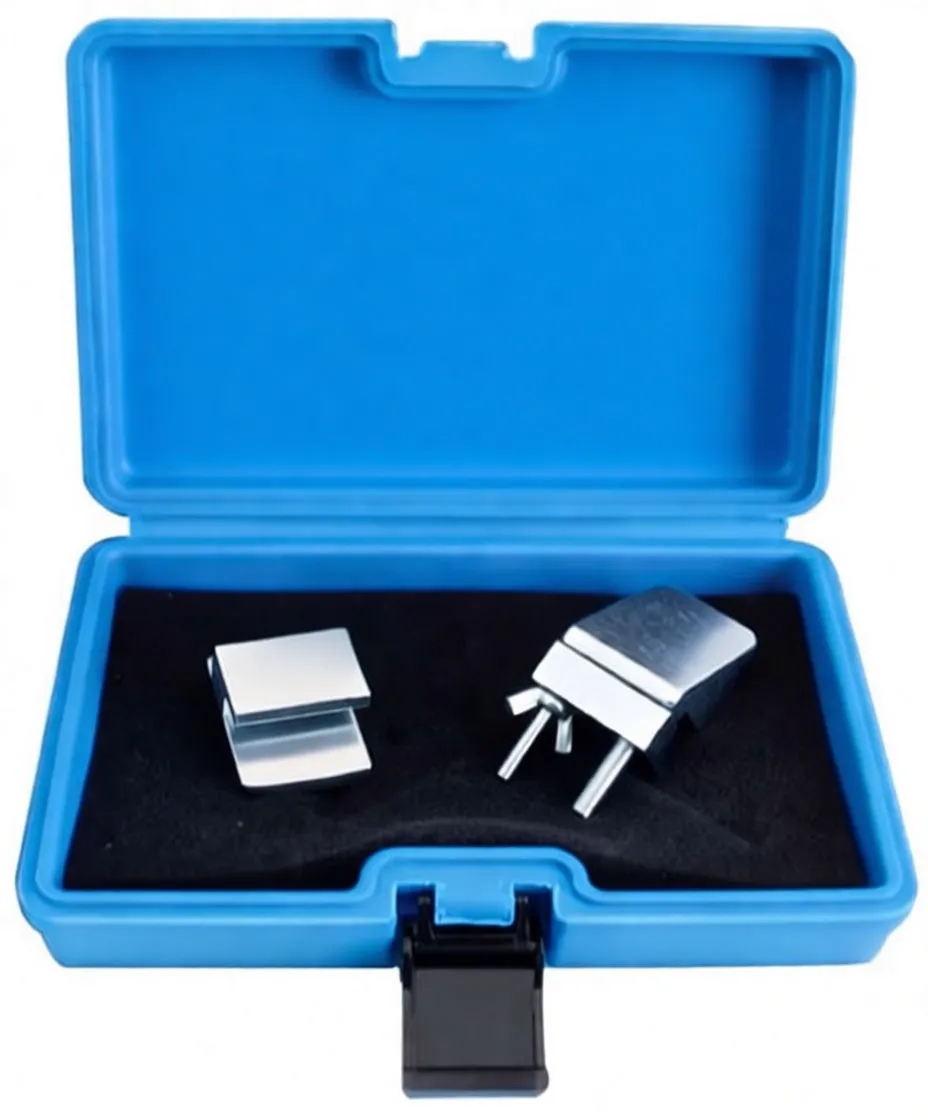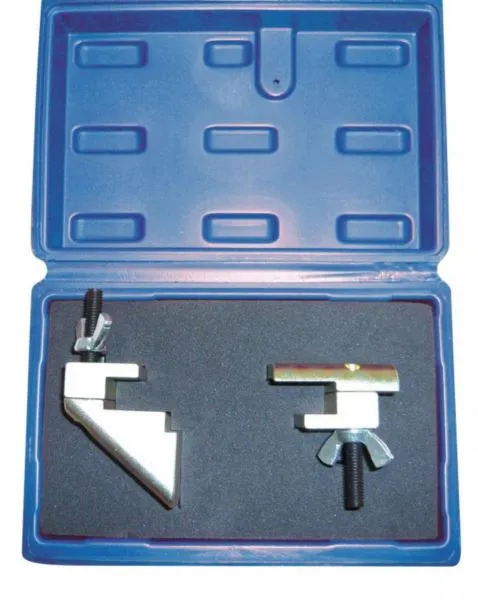 Professional-grade belt tensioning and alignment tools for safe poly-V belt service without damage. Includes two precision clamps and protective carrying case.