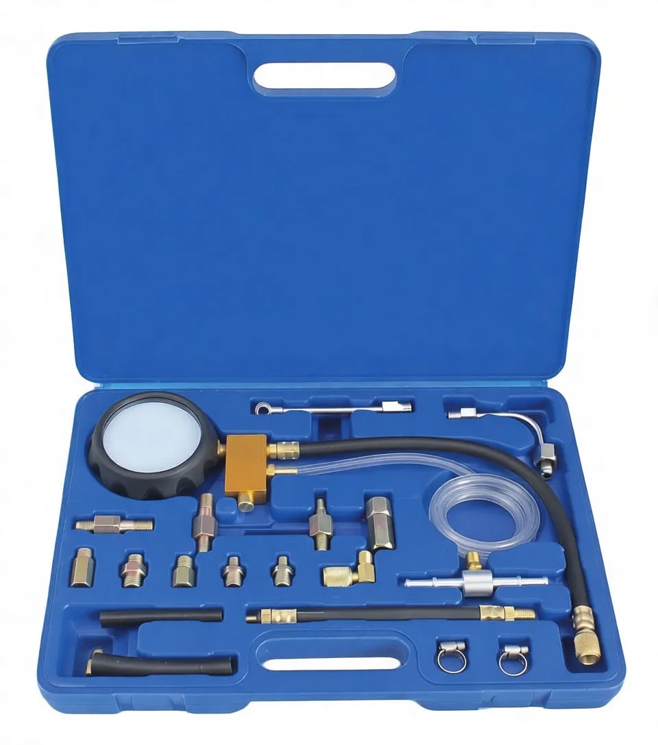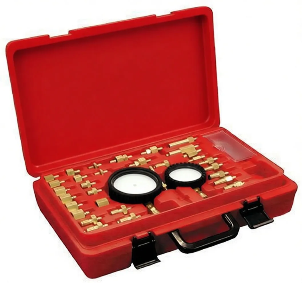 Complete fuel injection diagnostic kit with dual-range gauges and 30+ adapters for Ford, GM, Bosch, and Honda systems. Professional-grade pressure testing solution.