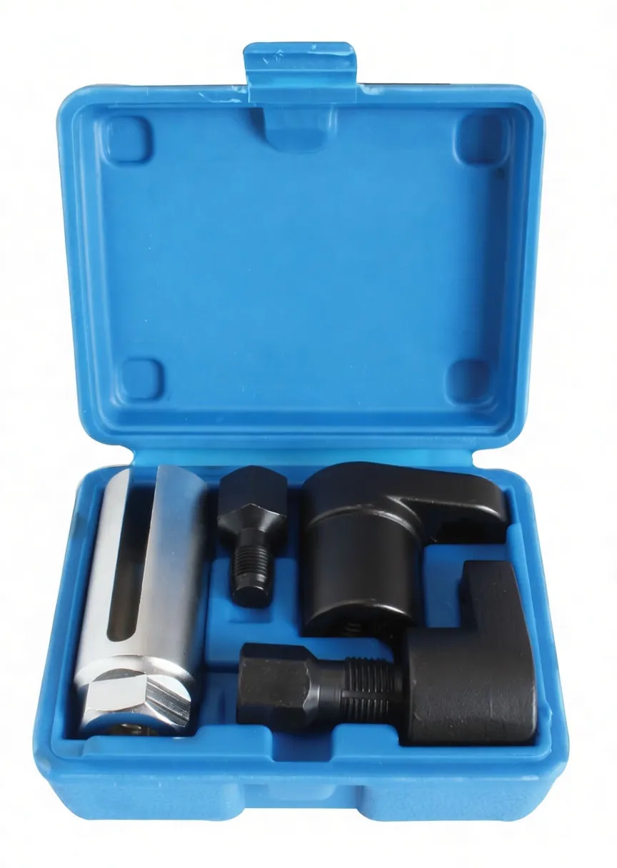 Complete oxygen sensor maintenance kit with slotted sockets, thread chaser, and offset wrenches for multi-vehicle applications.