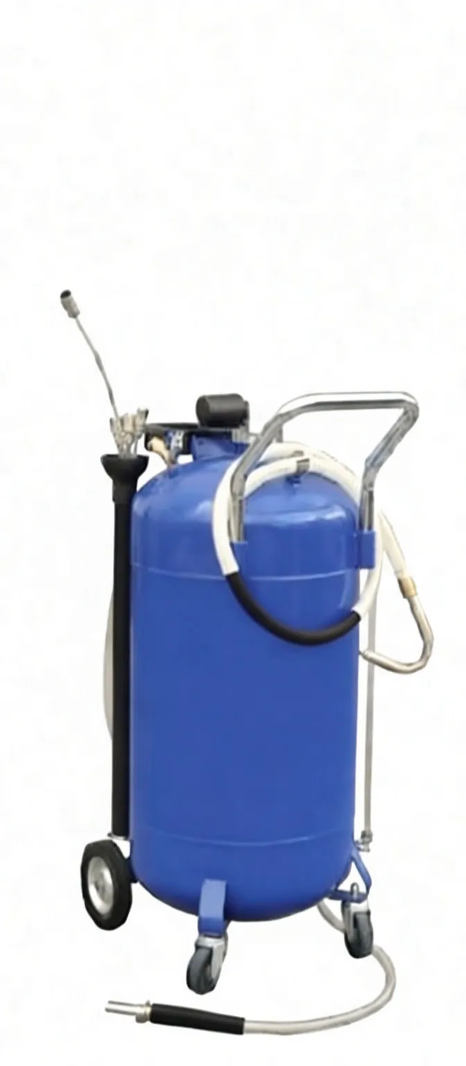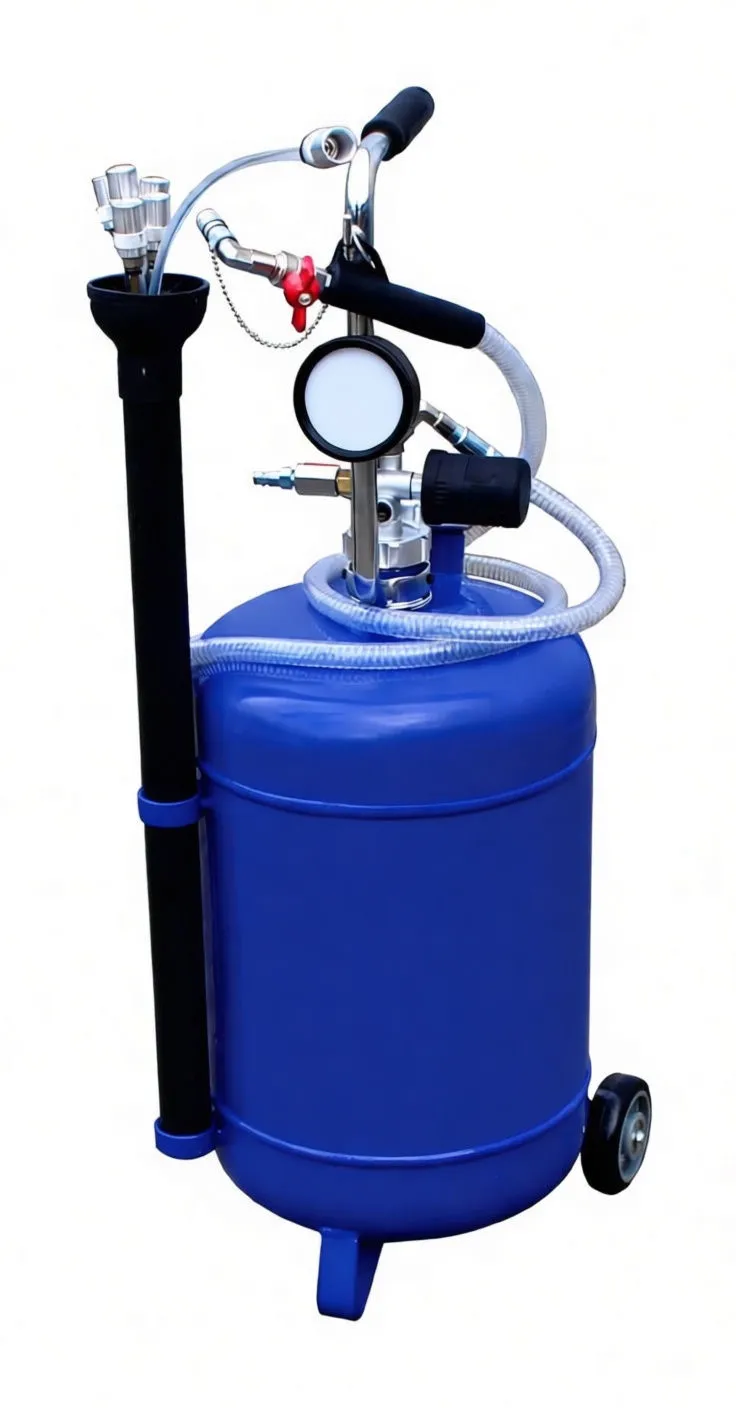 Portable pneumatic oil extractor with 65L capacity, six suction probes, and quick-disconnect couplers for efficient fluid recovery across automotive applications.