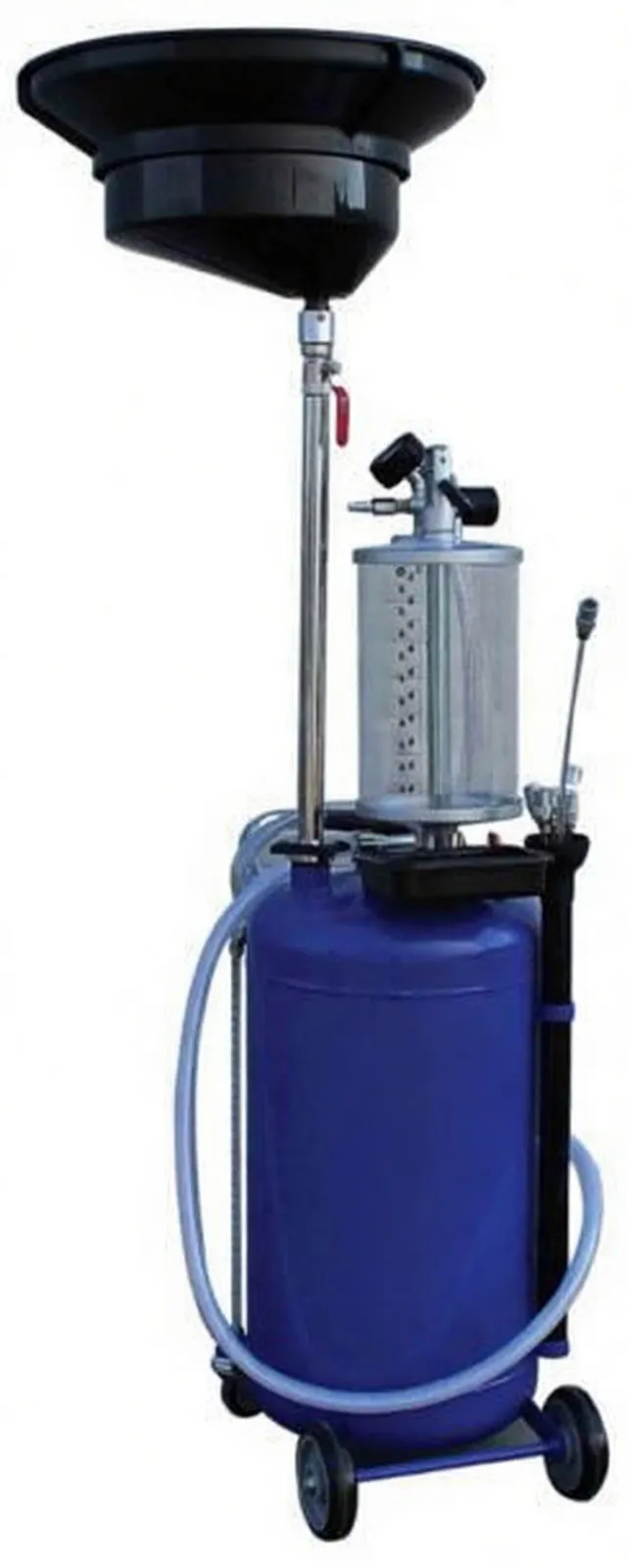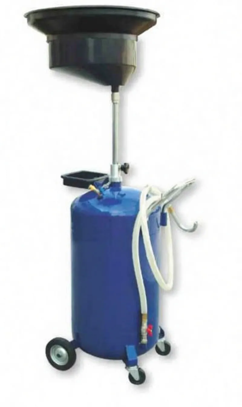 Professional pneumatic oil drainer with 65L capacity and adjustable collection bowl for efficient multi-vehicle servicing.