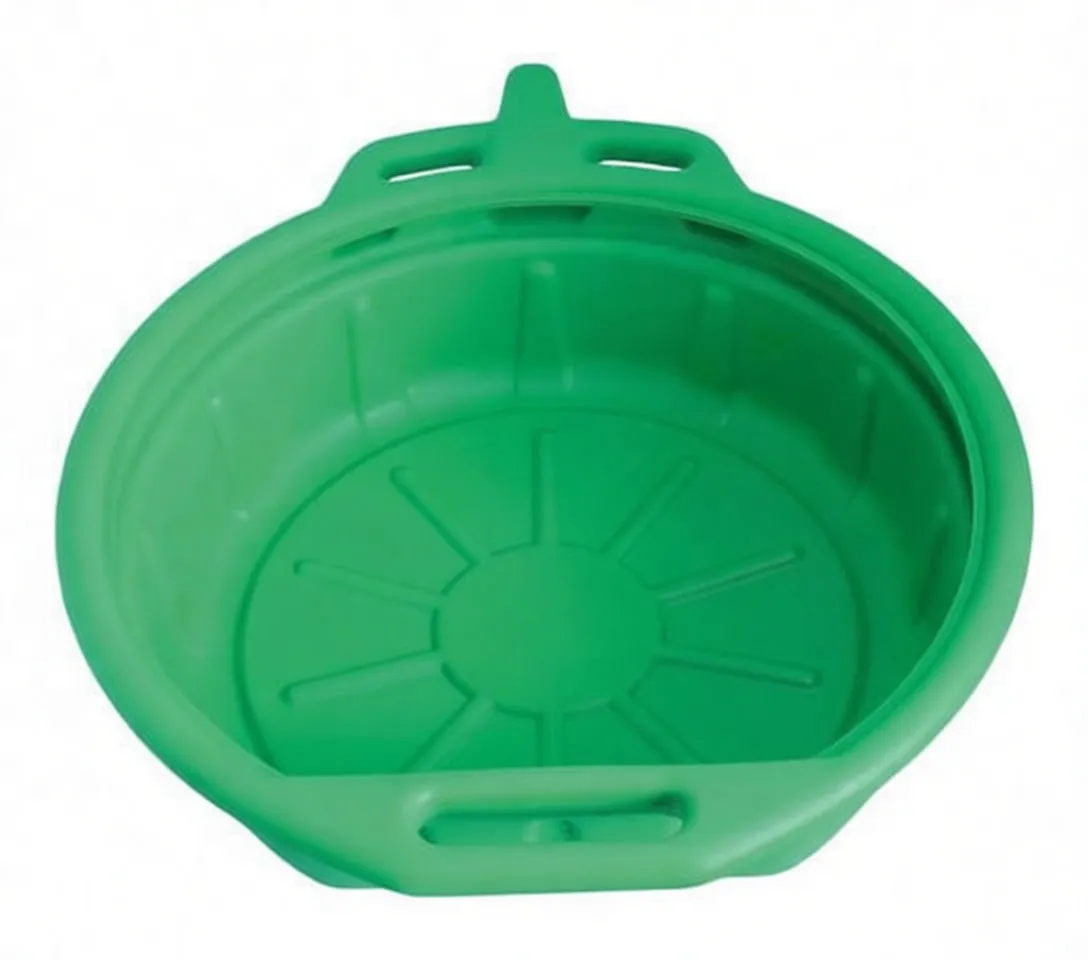 Durable 3-liter plastic drain pan for oil, coolant, and fluid changes. Portable design with integrated handles and spout for efficient fluid collection.
