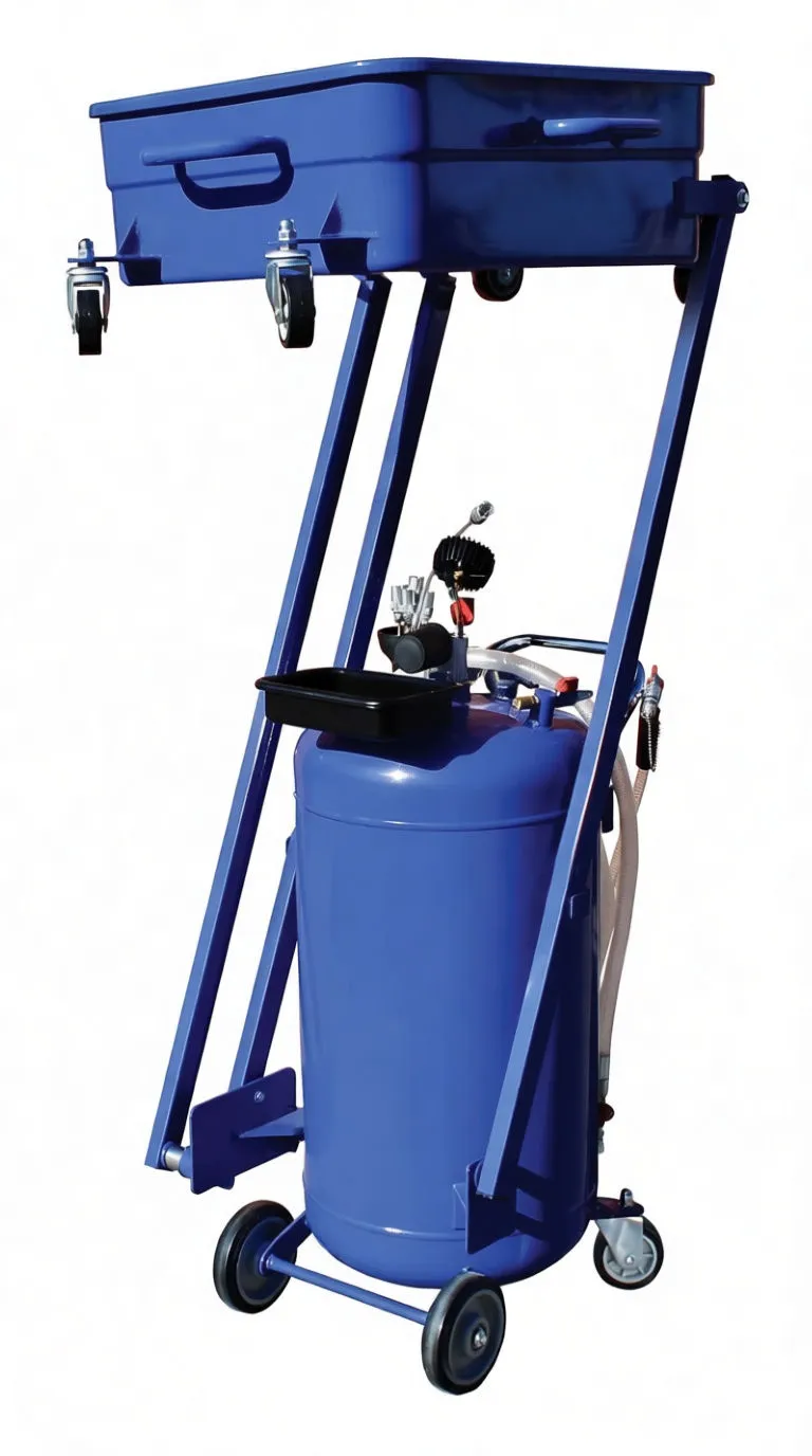 Mobile 90L oil extraction system with adjustable pantograph tray and pneumatic emptying for efficient fleet maintenance.