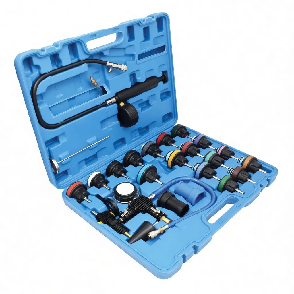 Complete cooling system diagnostic kit for pressure testing, leak detection, and coolant service across 30+ vehicle brands.