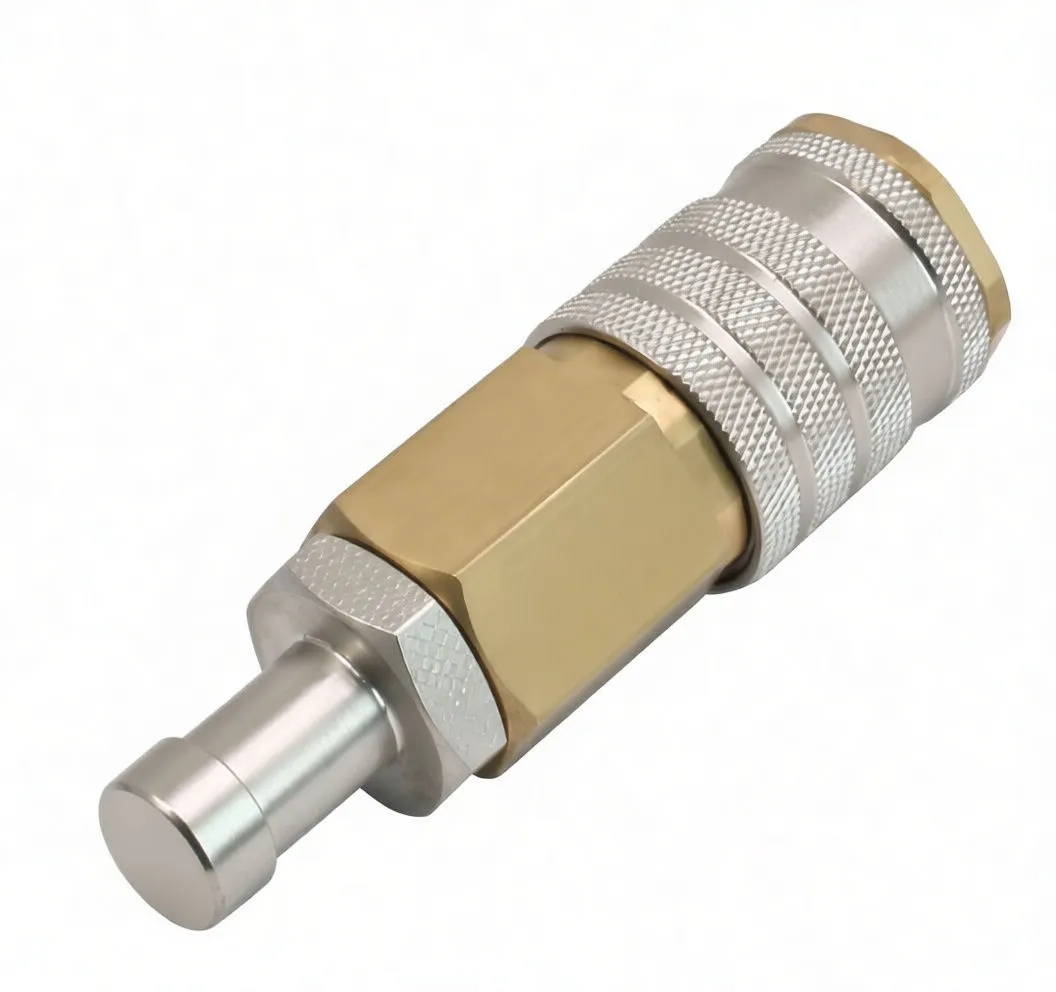 Quick-connect radiator adapter for Scania 340/360 vehicles. Spring-loaded valve mechanism prevents spillage during fluid transfer.