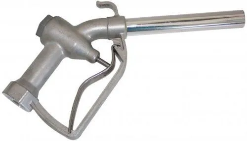 Heavy-duty aluminium fuel/diesel nozzle with lever trigger and integrated lock, suitable for electric pumps and gravity systems.
