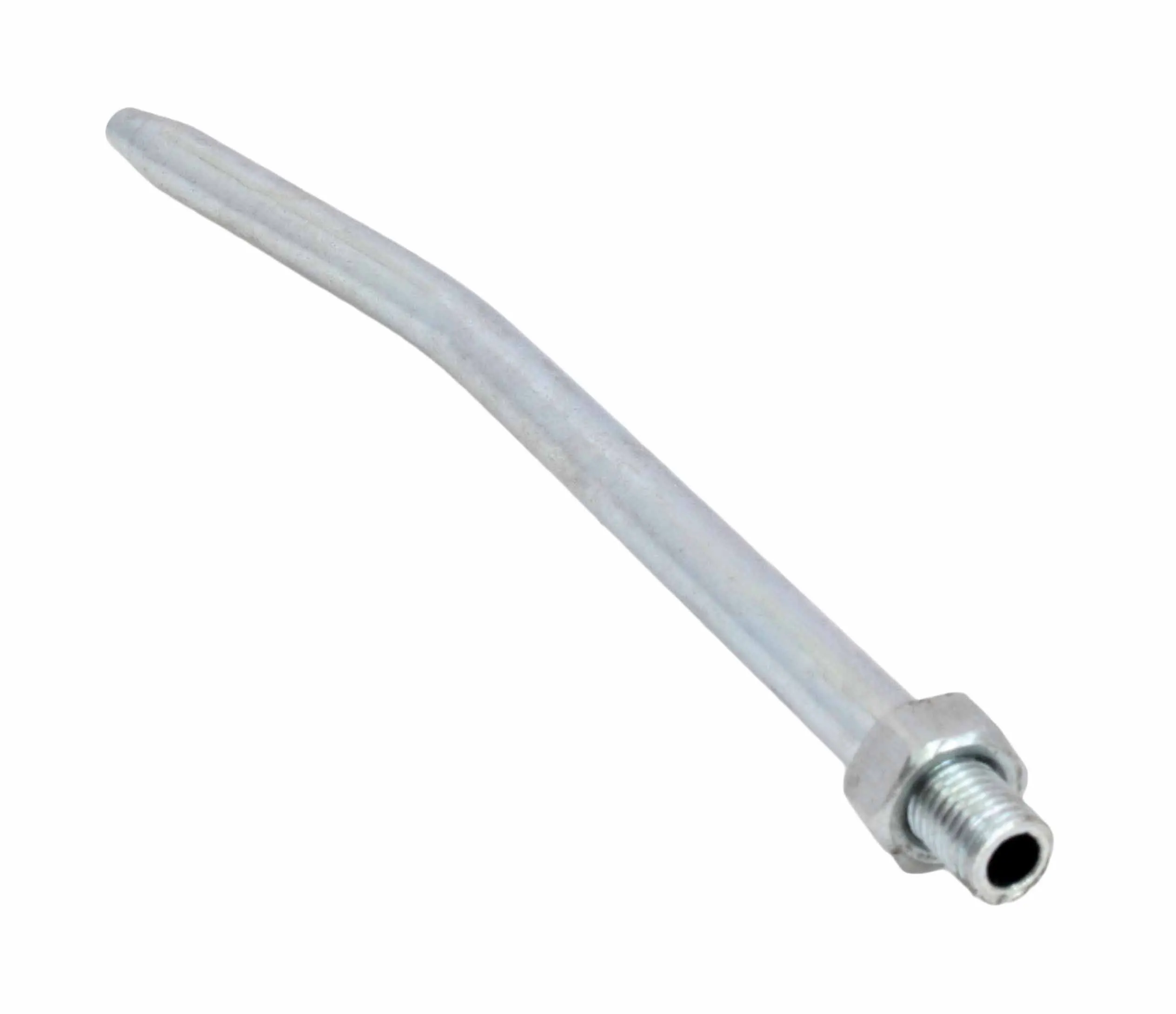 Precision-machined galvanized steel oil tube with tapered nozzle and threaded inlet for reliable oil system delivery.