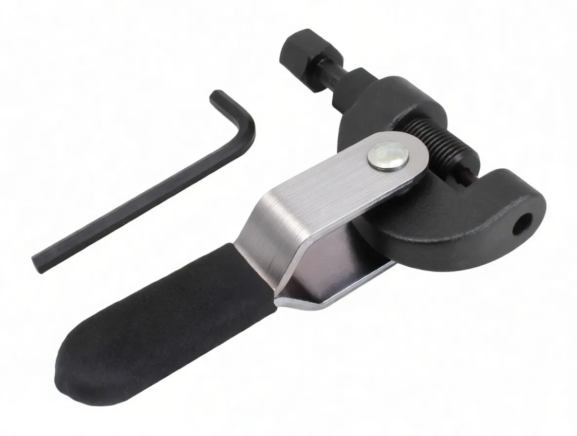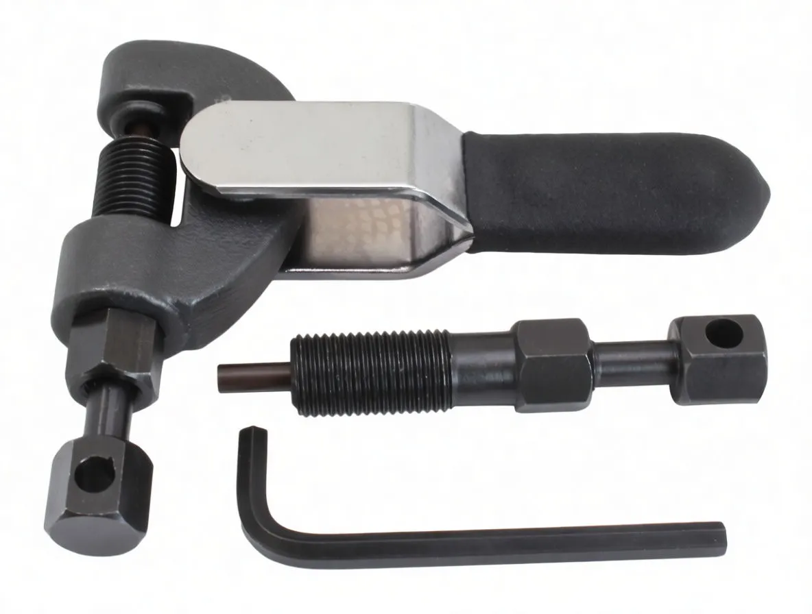 Professional chain breaker for 420-530 chains with folding handle and integrated pin driver. Essential for quick chain service and maintenance.