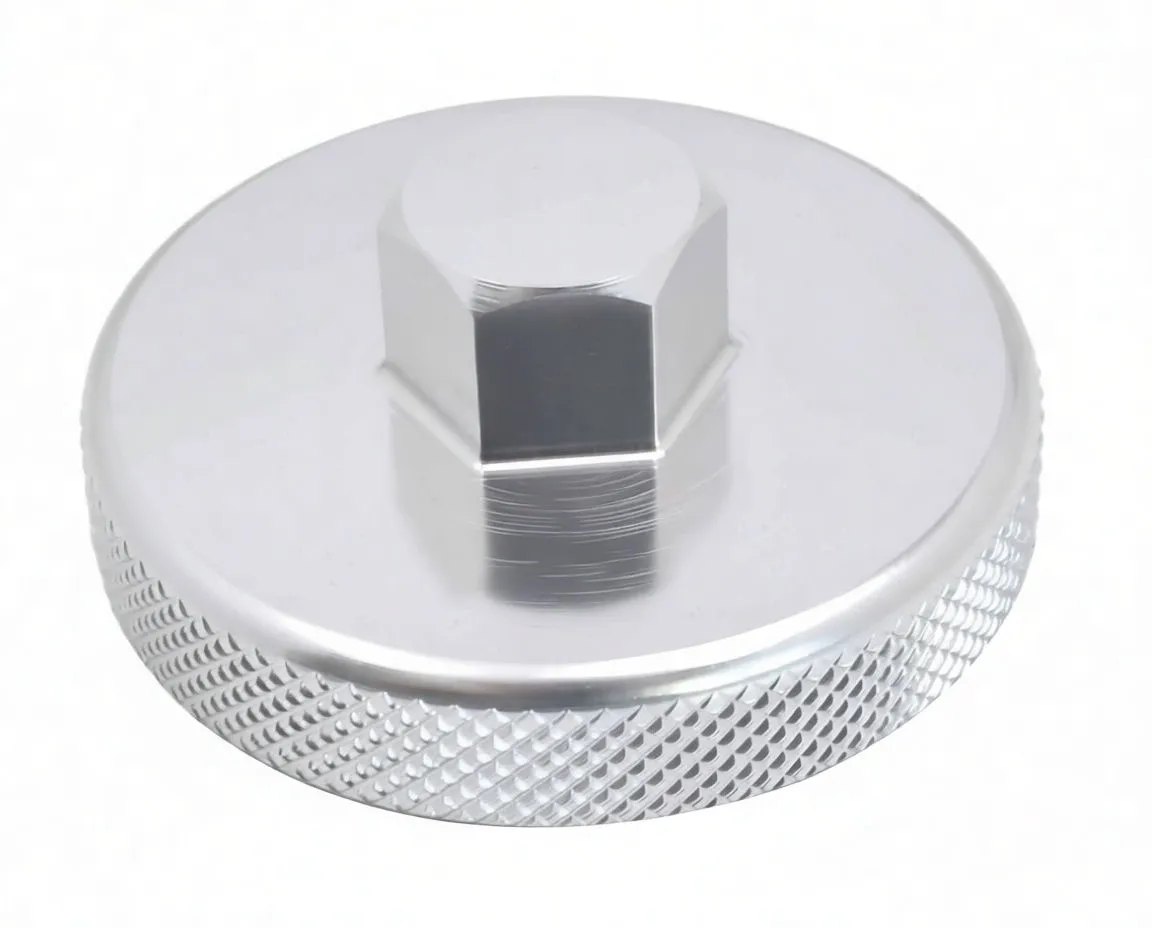 Precision-machined fork cap tool for Showa BPF 43mm suspension forks. Hand-operable design with knurled grip and hex boss engagement.