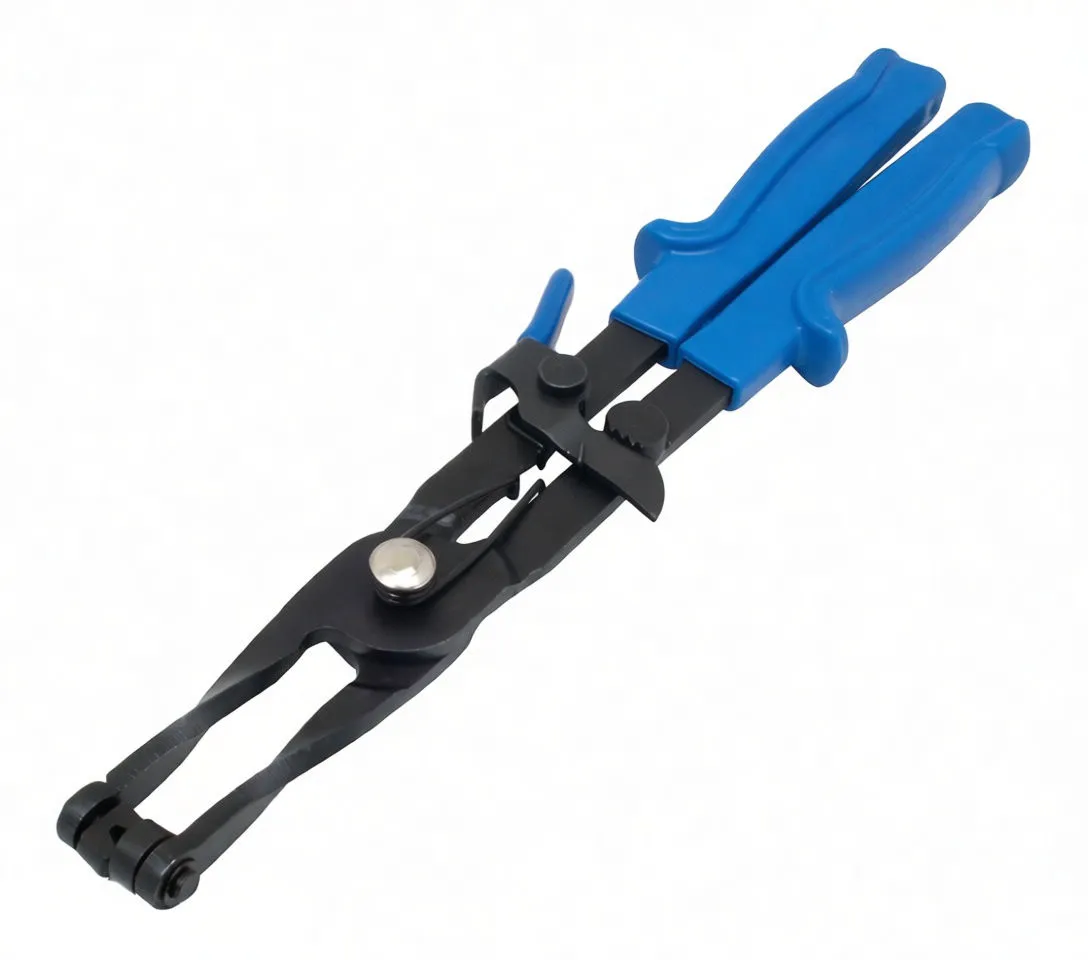 Professional-grade pliers designed for precise engagement and release of self-clamping hose clips with integrated locking mechanism.