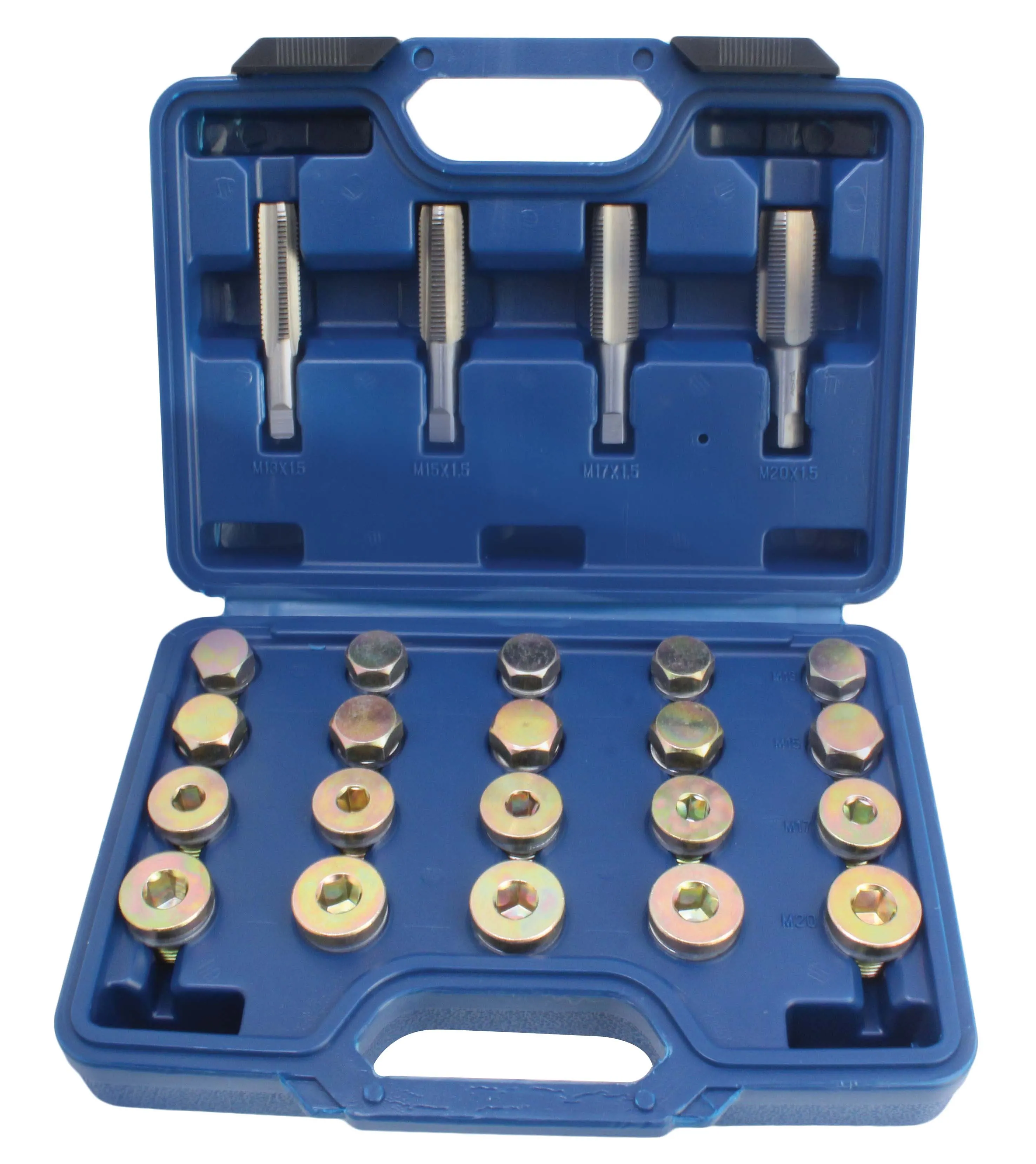 Complete thread repair kit for damaged oil pan and drain plug holes. Includes taps, replacement plugs, and gaskets for M13, M15, M17, M20 threads.