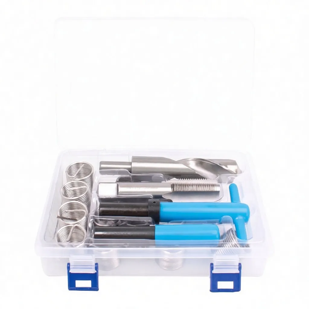 Professional thread repair kit with helicoil inserts, tap, drill bit, and installation tools for stripped threaded holes.