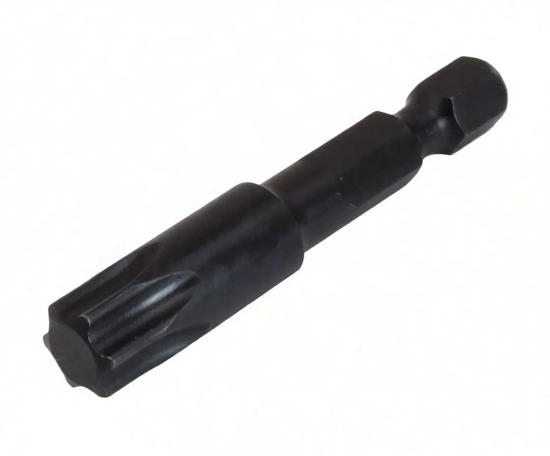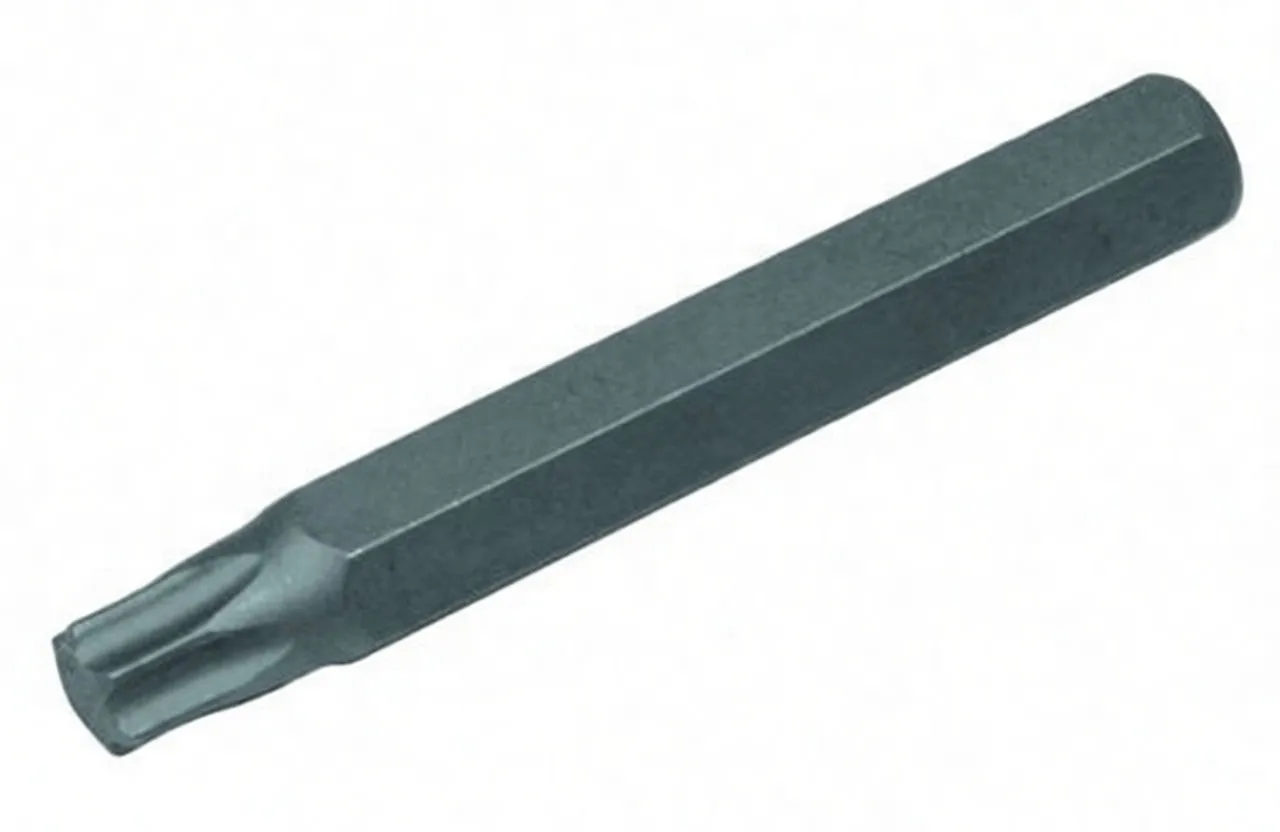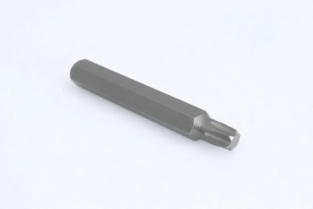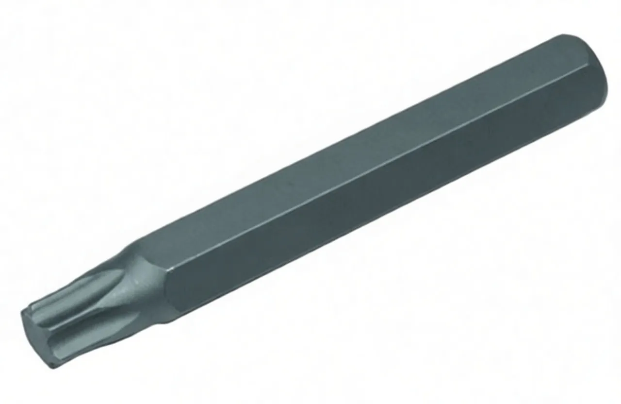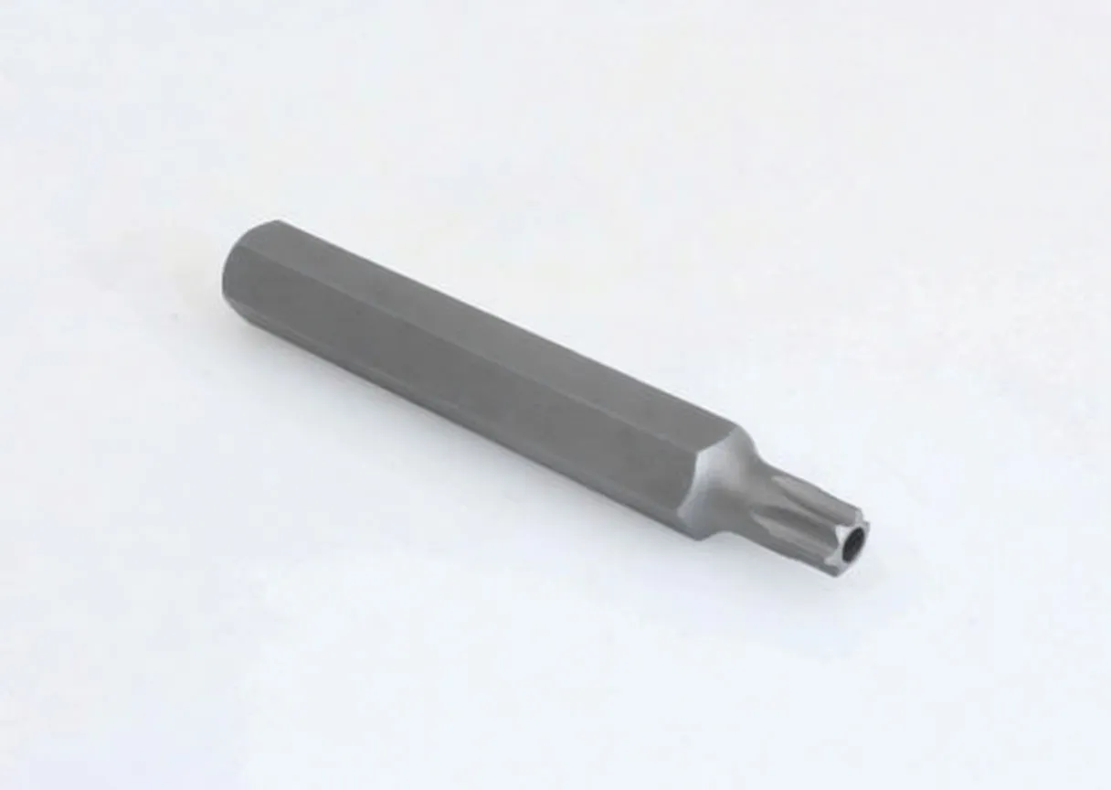 Hardened steel Torx T45 bit with 10mm hex shank for secure fastening in tight spaces and precision assembly work.