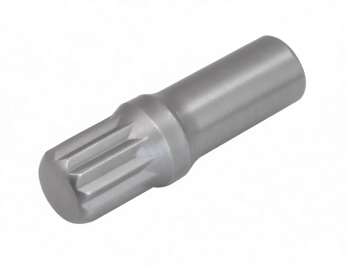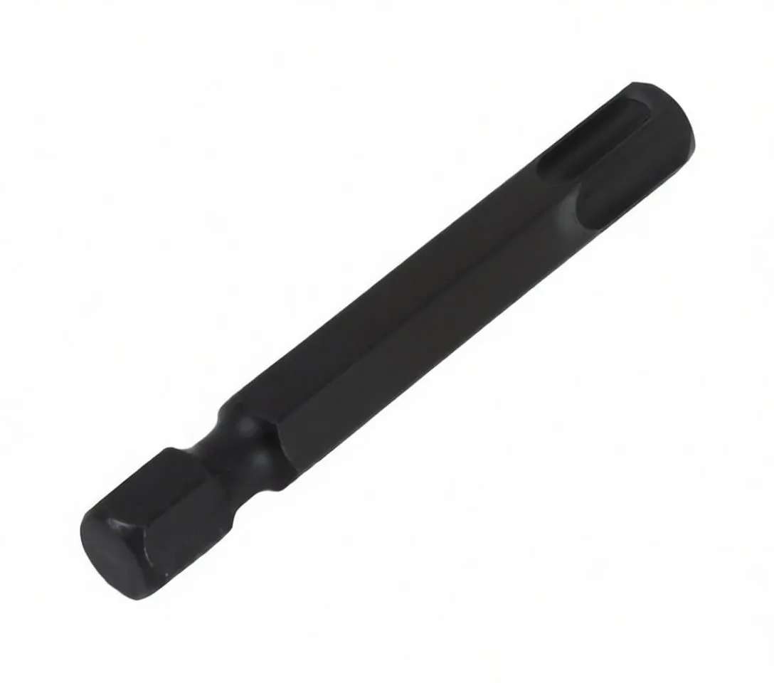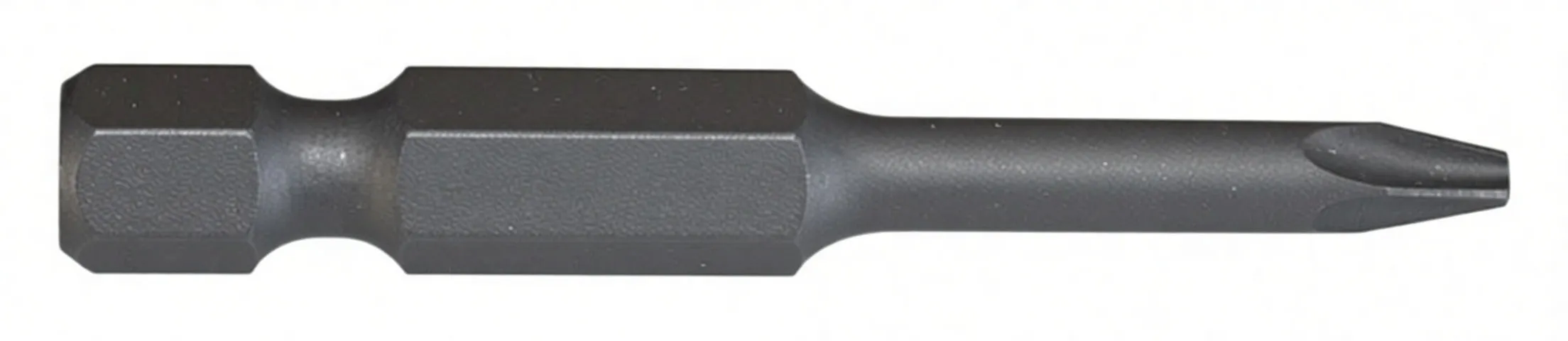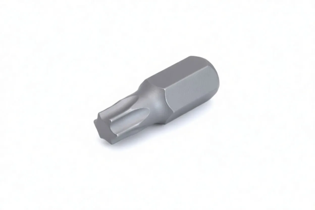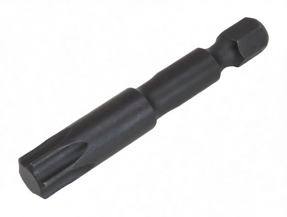 Hardened steel Torx T45 bit with 10mm hex shank for secure fastening in tight spaces and precision assembly work.