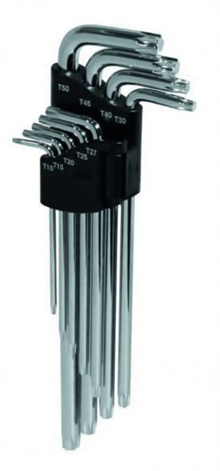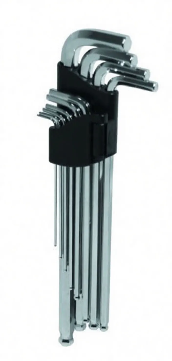 Professional extra-long ball-end hex key set with 10 sizes (1.5-10mm). Chrome-plated, organized holder. Essential for tight spaces and angled access.