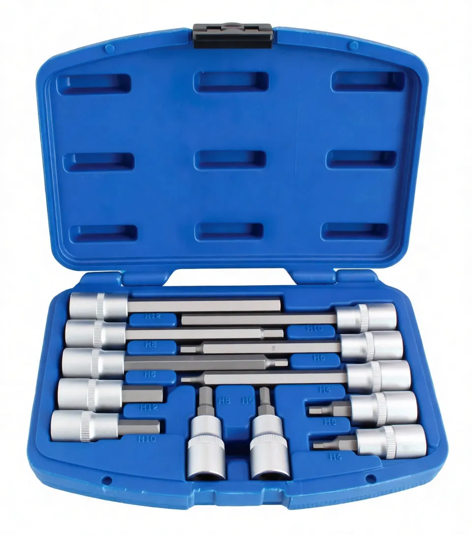 Professional 12-piece hex bit socket set in sizes 4-12mm, two lengths, chrome-vanadium construction with hard plastic carrying case.