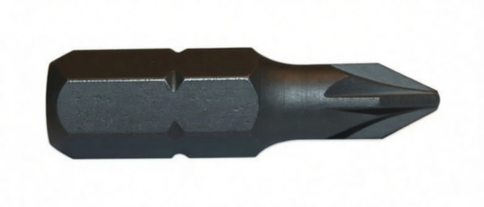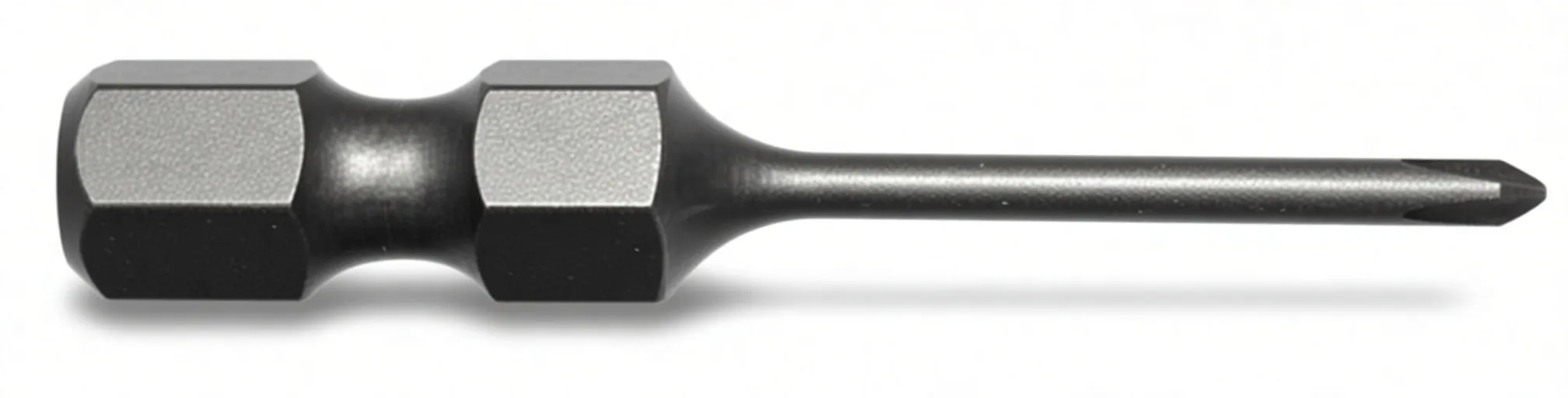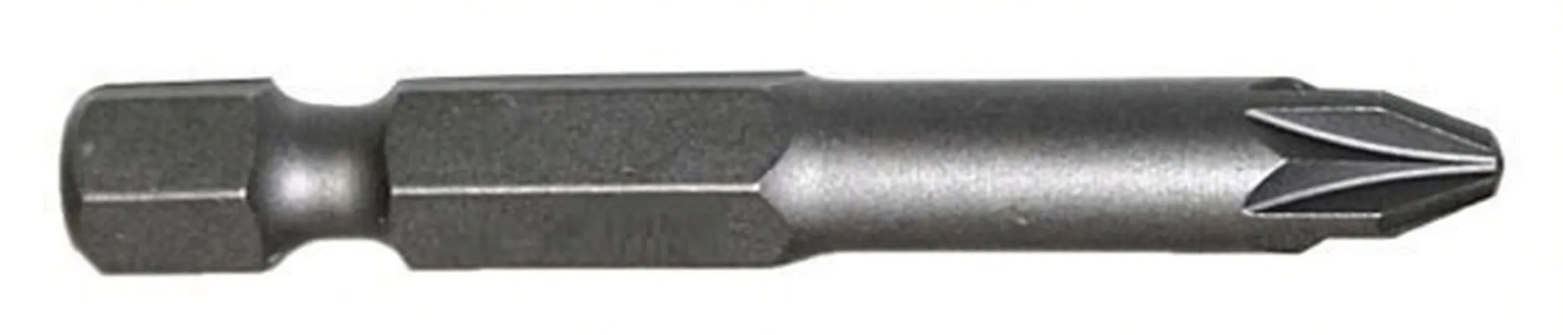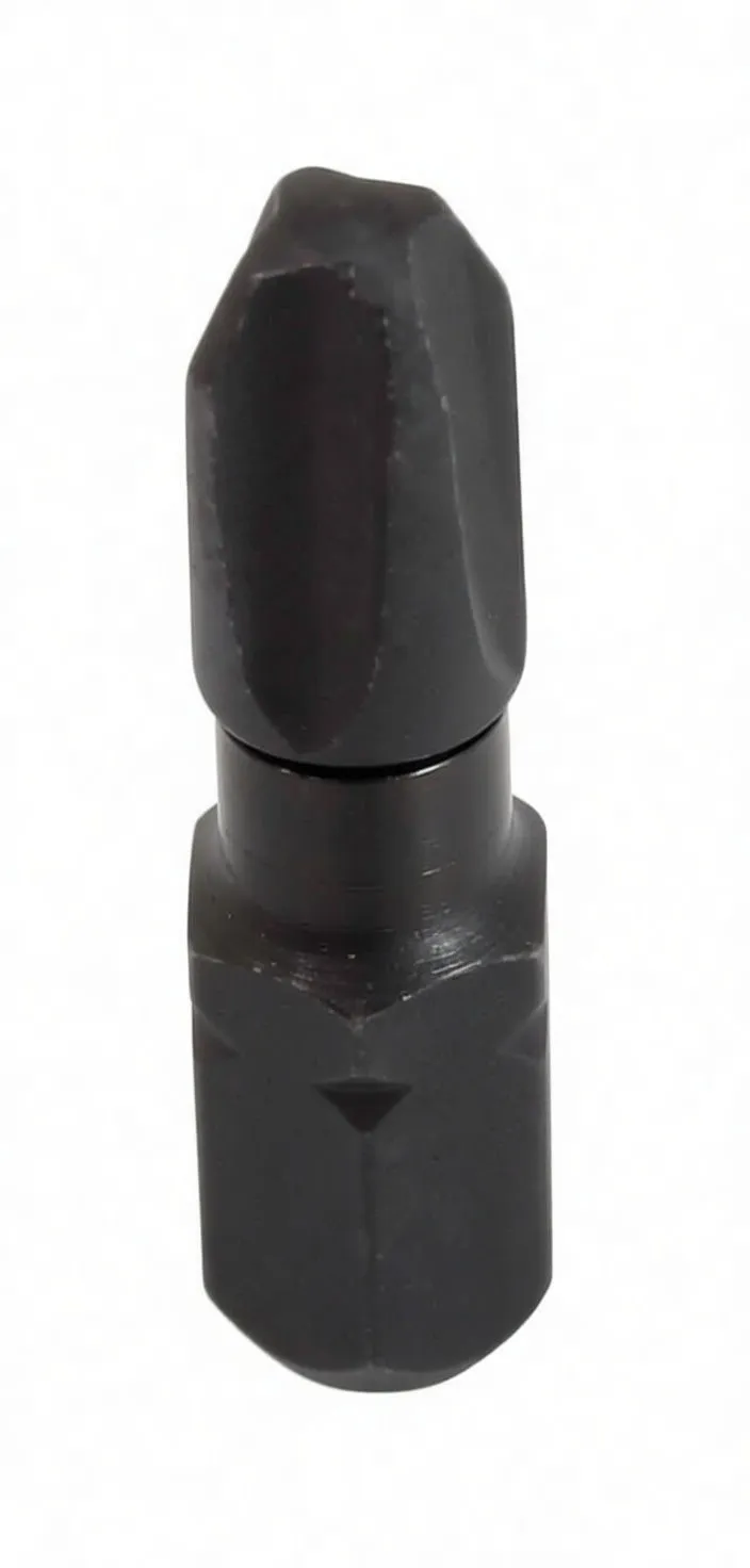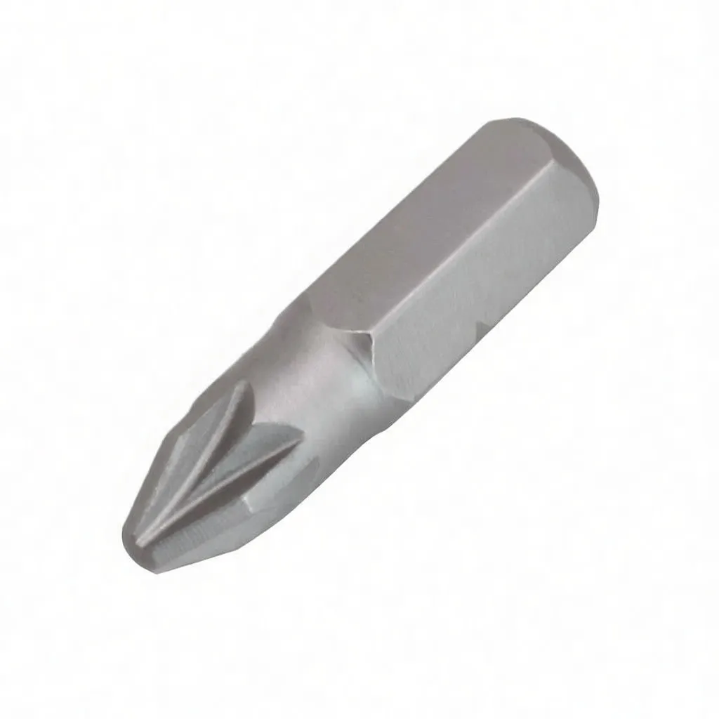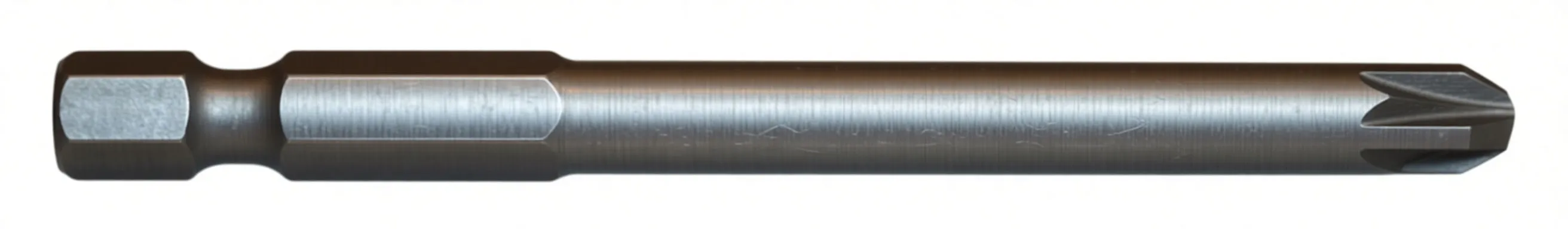 Compact impact-rated Phillips bit with torsion zone for controlled energy absorption in tight spaces and precision fastening.