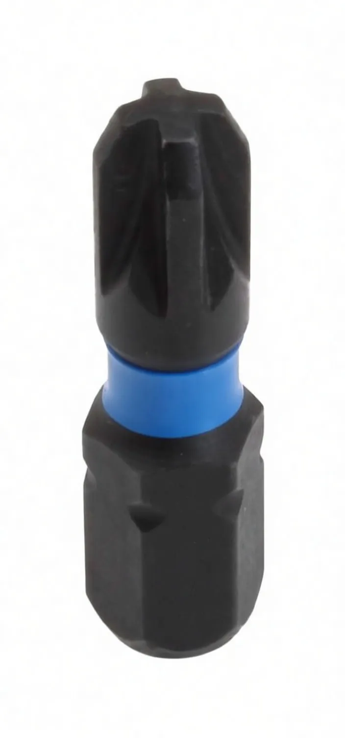 Compact impact torsion bit for TX25 fasteners. Hardened steel with torsion collar for reduced cam-out in impact driver applications.