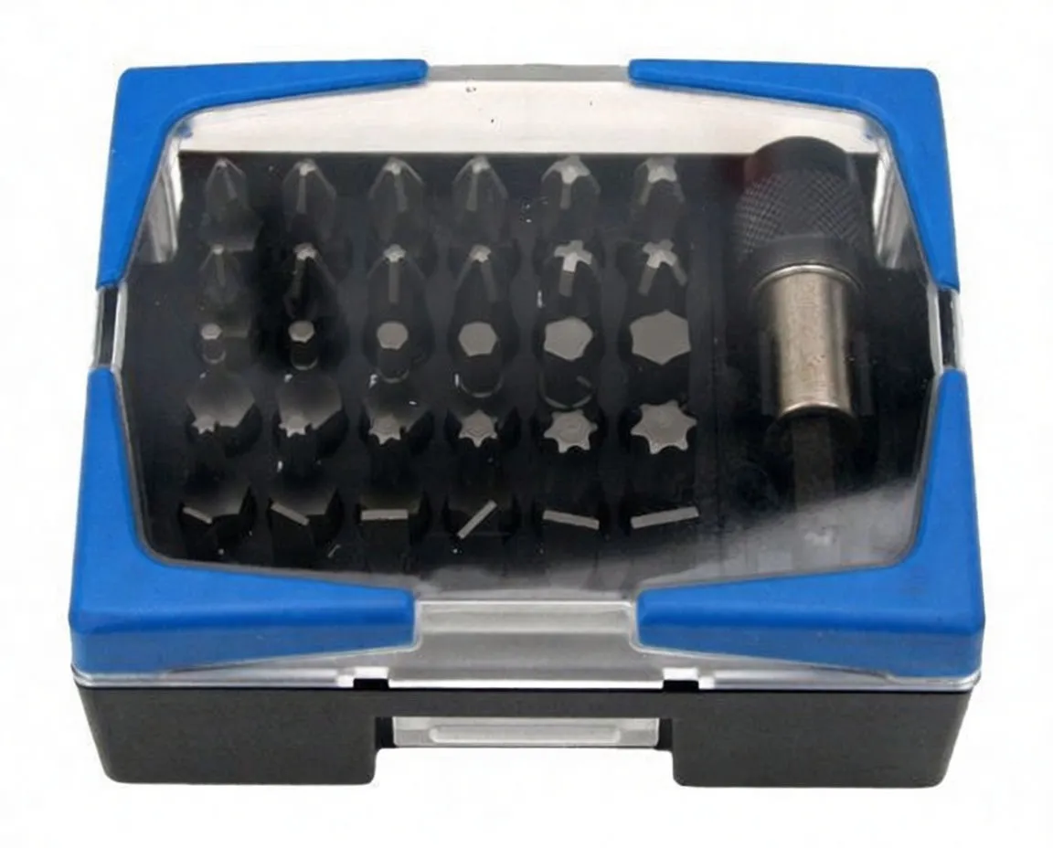 Essential 31-piece bit set featuring Phillips, Pozidriv, slotted, Torx, and hex bits in durable blue case for shop and field use.