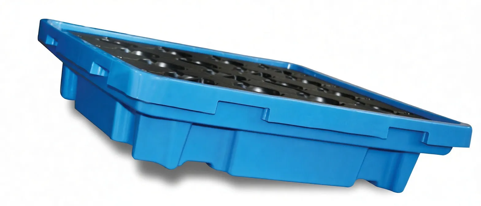 Heavy-duty 42L drip tray with removable grid for fluid containment, chemical and UV resistant, 300kg load capacity.