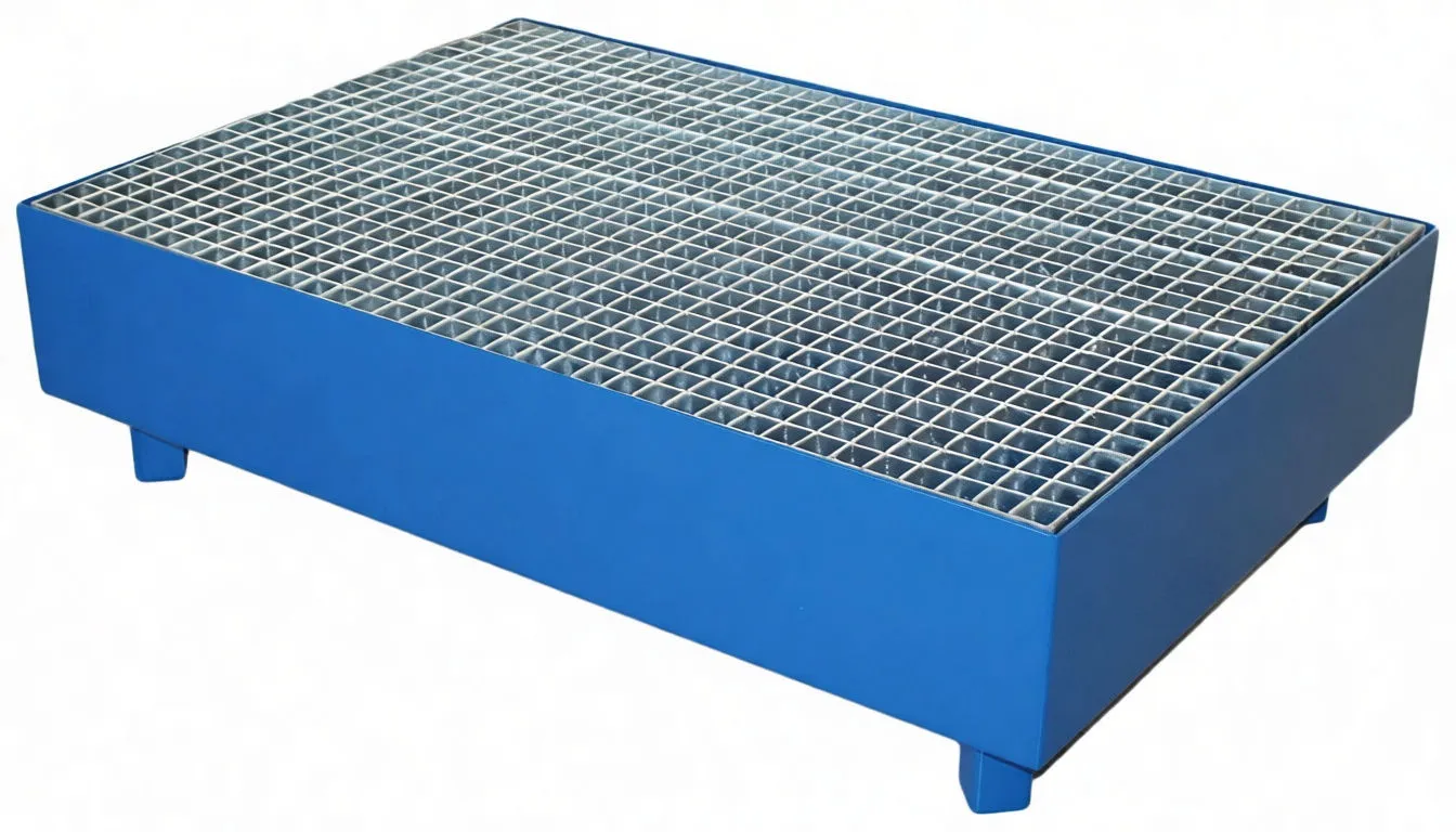 Industrial-grade spill containment bund for safe storage and secondary containment of two 220L drums, featuring galvanised steel grid and 220L sump capacity.