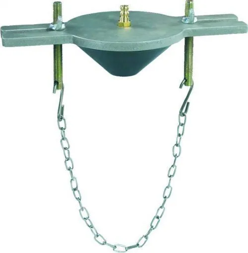 Versatile inflatable cone plug for sealing pipes and drains during maintenance, testing, and repairs with secure chain attachment.