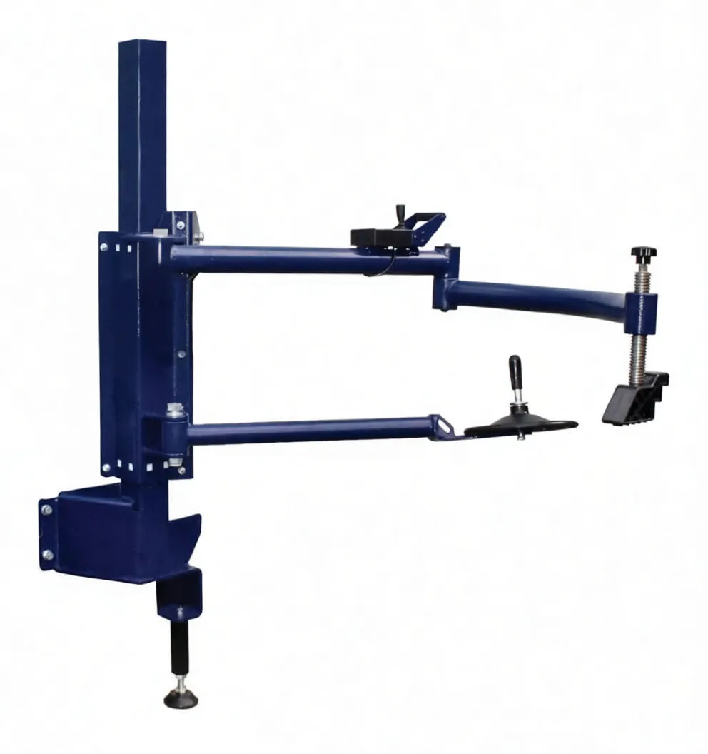 Heavy-duty pneumatic support arm with dual-axis positioning, joystick control, and versatile clamping options for professional workshops.