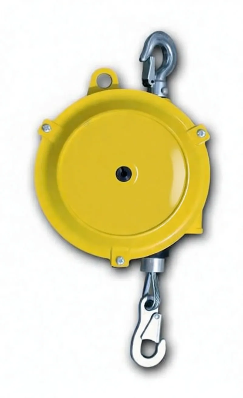 Industrial spiral spring balancer for 5–7 kg loads. 1.3 m cable, swivel safety hook, compact yellow housing. Ideal for assembly lines and precision work.