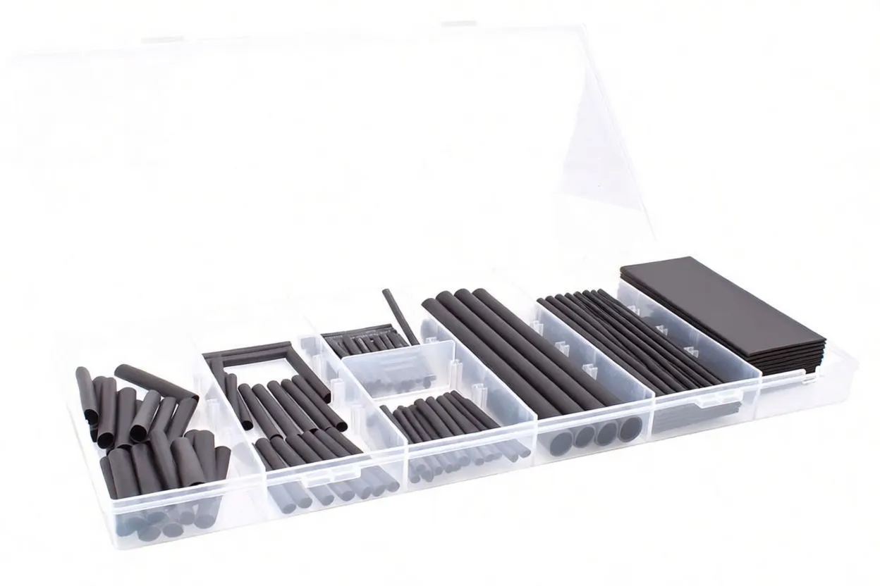 Essential 127-piece heat shrink assortment with seven sizes (2–13mm diameter) for electrical repairs, insulation, and wire protection in professional workshops.