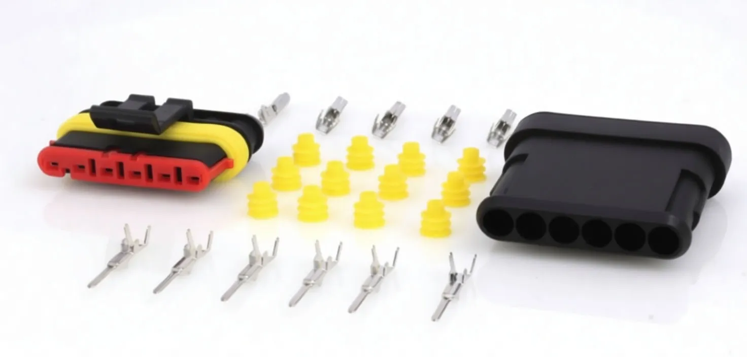 Complete 6-way waterproof connector system for automotive and industrial wiring. IP67-rated, 24V, includes housings, terminals, and seals.