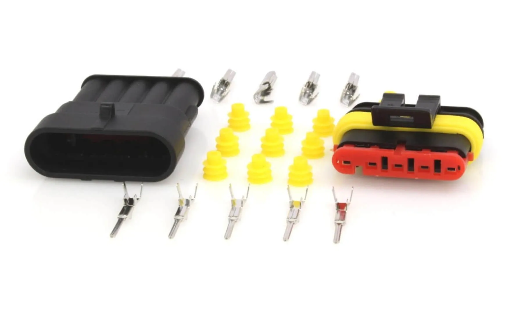 Complete sealed electrical connector system with crimp terminals and rubber seals for reliable outdoor and industrial wiring.