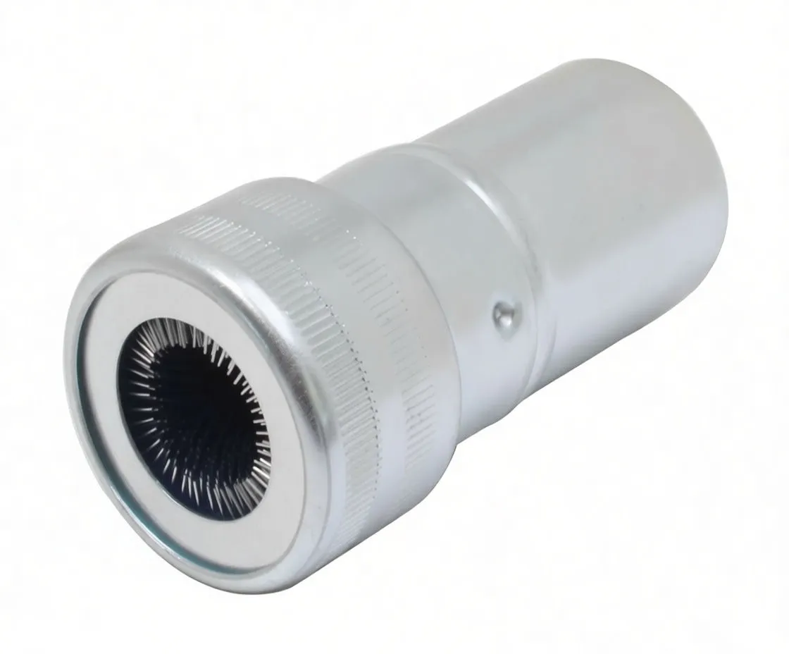 Dual-function battery terminal cleaning brush in durable metal case; removes corrosion and sediment for reliable electrical connections.