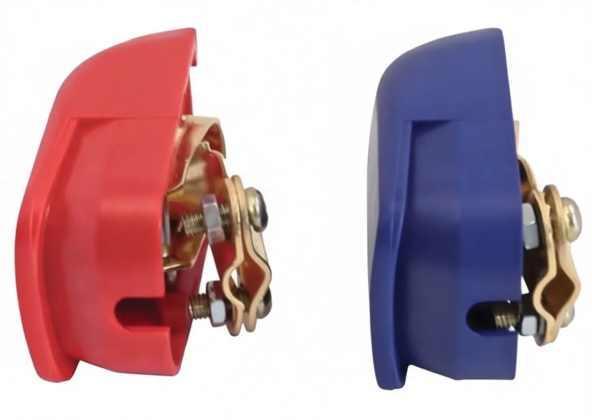 Heavy-duty self-clamping battery terminals for professional workshop use. Brass-plated contacts, color-coded design, fits 4-6 AWG cable.