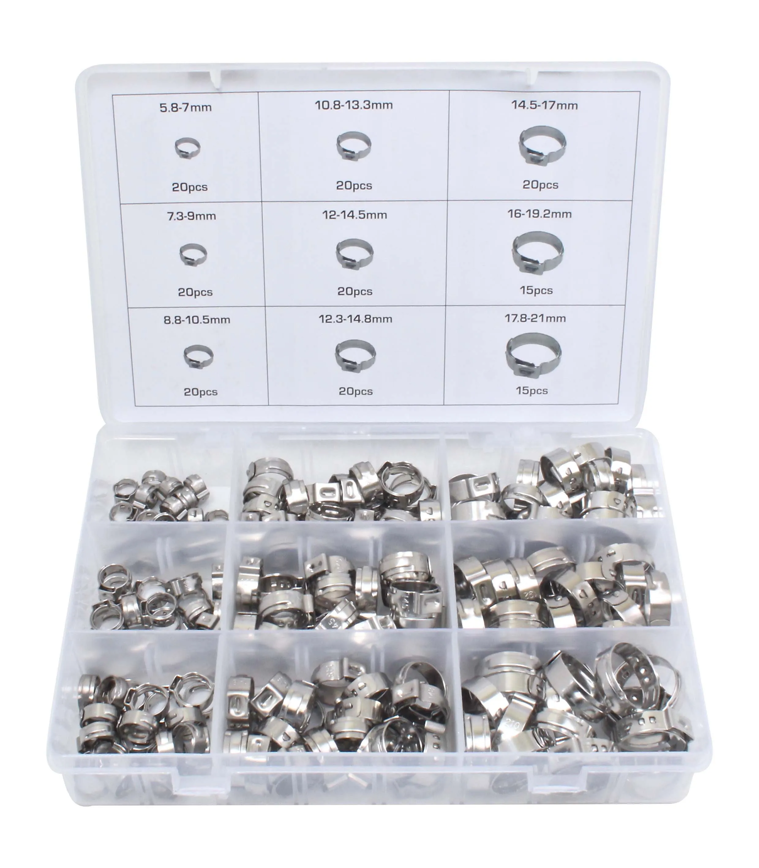 170-Piece Single-Ear Hose Clamps Assortment, Stainless Steel, 5.8–21mm Range
