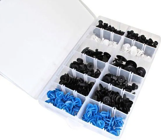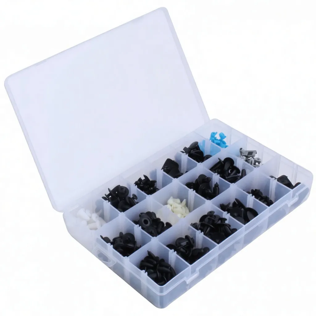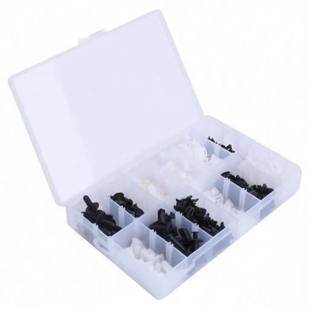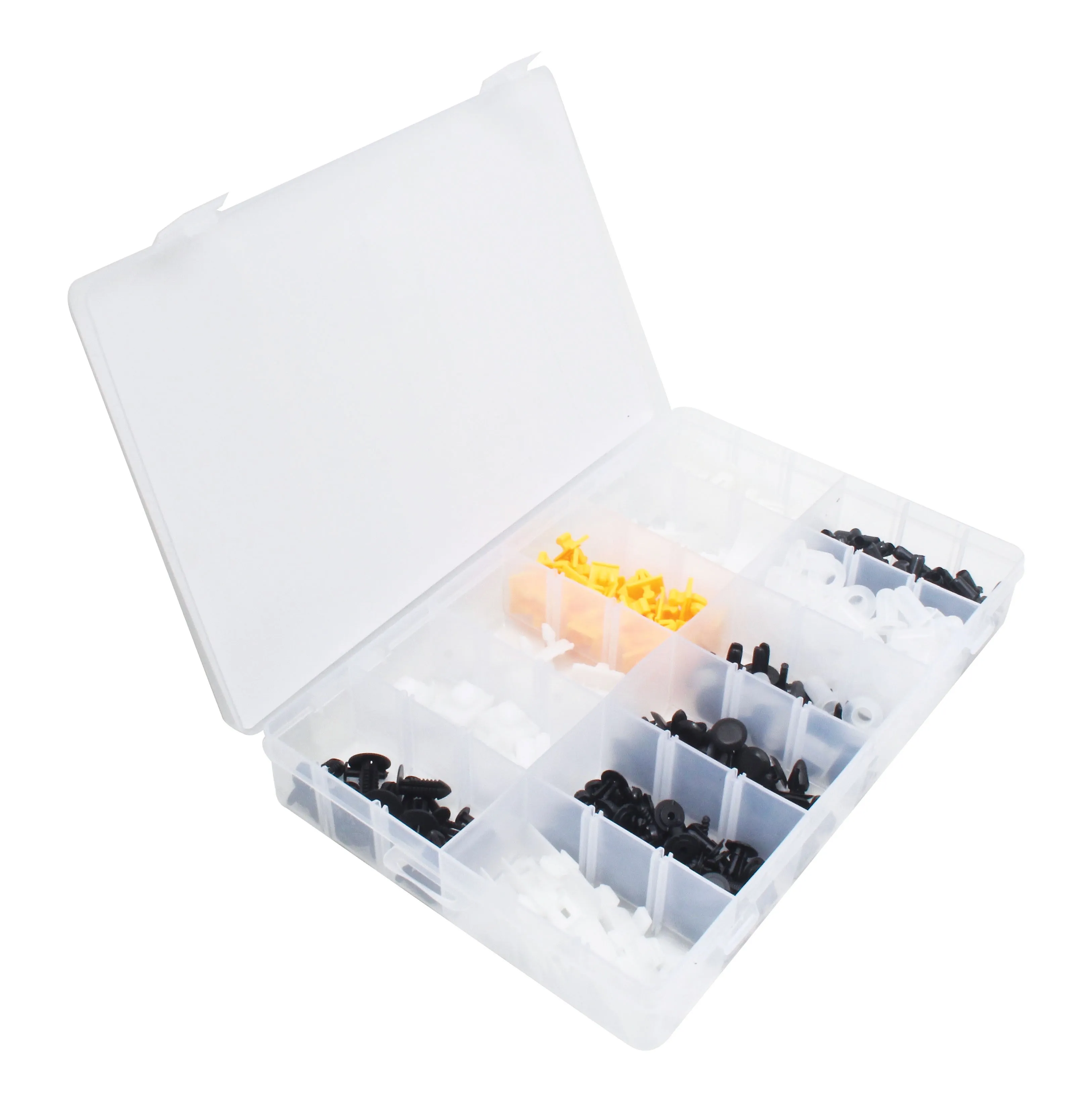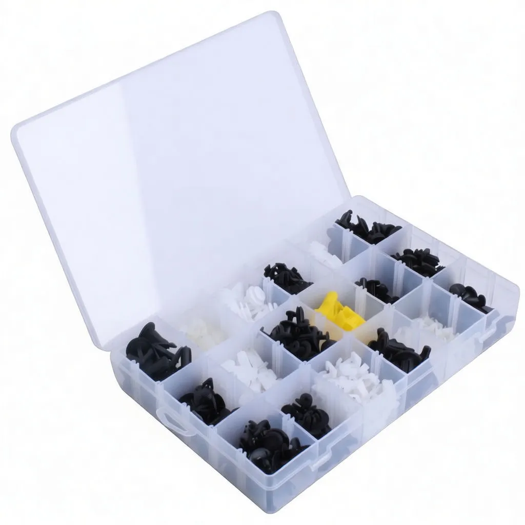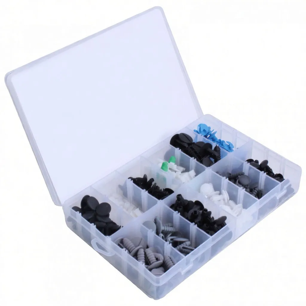 Comprehensive organizer box with 12 types of automotive trim clips and fasteners—ideal for upholstery, panel, and interior repairs.