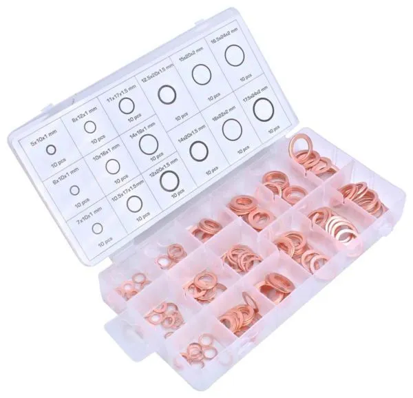 150-piece copper washer assortment (5mm–17.5mm) in organized compartments. Essential for plumbing, sealing, and hydraulic applications.